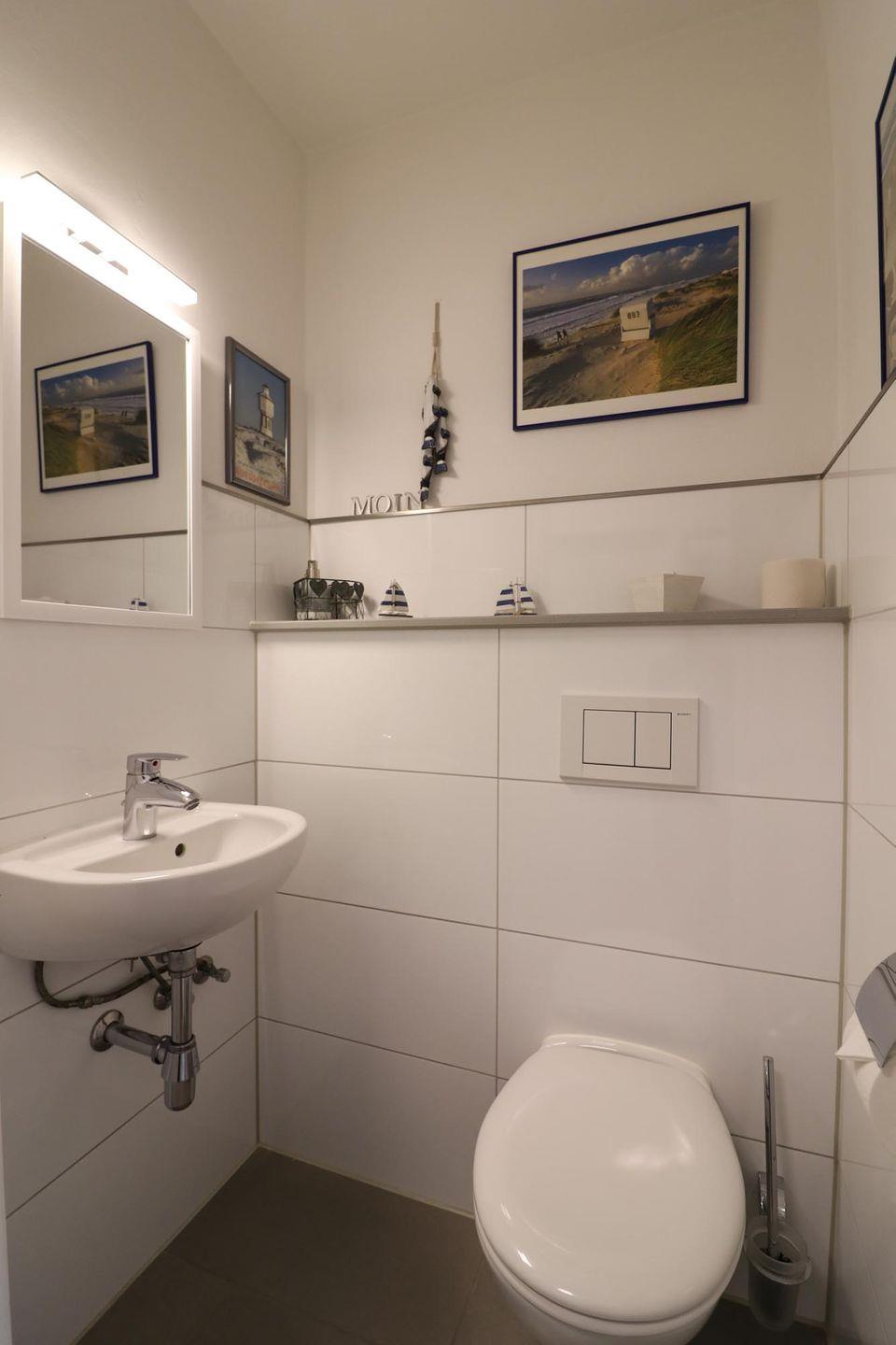Auf der anderen Seite des Flures finden Sie in zwei separaten Räumen die bodengleiche Dusche mit einer Handtuchheizung und einem Spiegel im Zimmer und das WC mit einem kleinen Waschbecken.