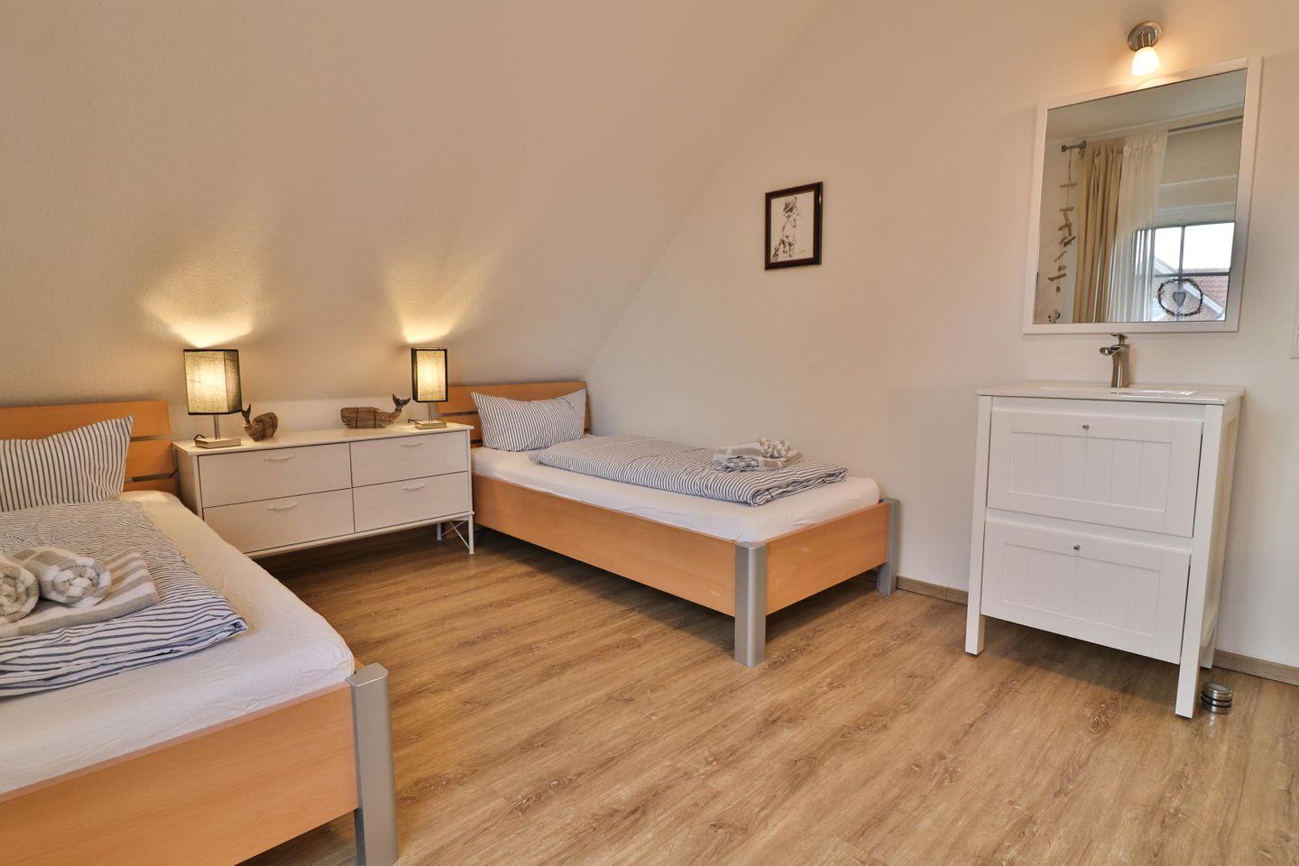 Im zweiten Schlafzimmer befinden sich zwei Einzelbetten (je 90 x 200 cm), ein Kleiderschrank und darüber hinaus ein kleiner Schreibtisch. Auch hier finden Sie ein zusätzliches Waschbecken.