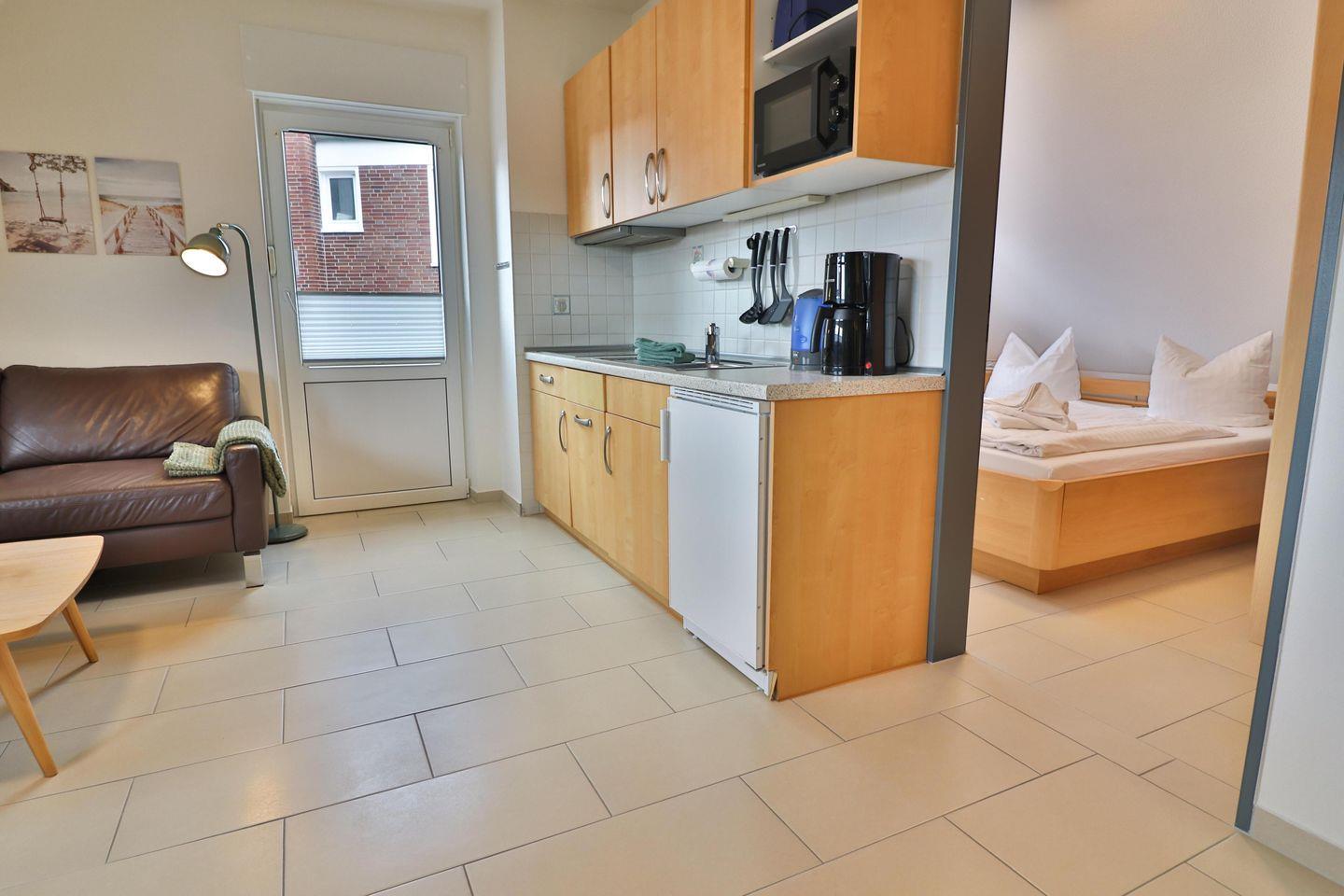 Die helle Wohnküche mit Zugang zum Balkon bietet Ihnen neben einem bequemen Sofa und einem Cocktailsessel, einen Esstisch sowie eine Küchenzeile, die reichlich Platz bietet, um ein leckeres Essen zu zaubern. Das 4-Platten-Ceranfeld mit Dunstabzug ermöglicht Ihnen bequemes Kochen. In der Küche finden Sie außerdem ein großes Spülbecken, Mikrowelle, Spülmaschine, Kühlschrank, Filterkaffeemaschine, Toaster und Wasserkocher. Neben diversen Küchenutensilien und einer großen Auswahl an Geschirr steht Ihnen darüber hinaus Teegeschirr zur Verfügung, um entspannte Urlaubstage bei einer Tasse Ostfriesentee ausklingen zu lassen. Zu Ihrer Unterhaltung dient in diesem Raum der variabel drehbare Fernseher.