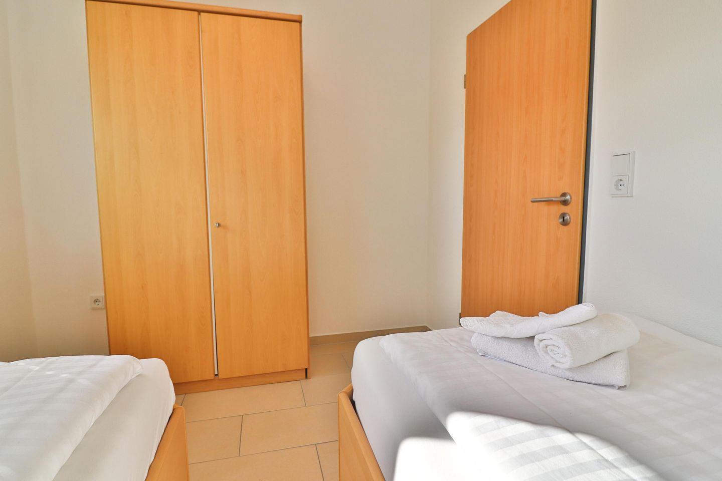 Diese Ferienwohnung verfügt über ein Hauptschlafzimmer mit einem komfortablen Doppelbett der Größe 180×200 cm, einem großen Kleiderschrank und praktischen USB-Steckdosen mit Leuchtfunktion zum einfachen Aufladen elektronischer Geräte. Das zweite Schlafzimmer ist mit zwei Einzelbetten der Größe 90×200 cm ausgestattet. Auch in diesem Zimmer steht Ihnen ein Kleiderschrank für Ihre persönlichen Gegenstände zur Verfügung USB-Steckdosen mit Leuchtfunktion.