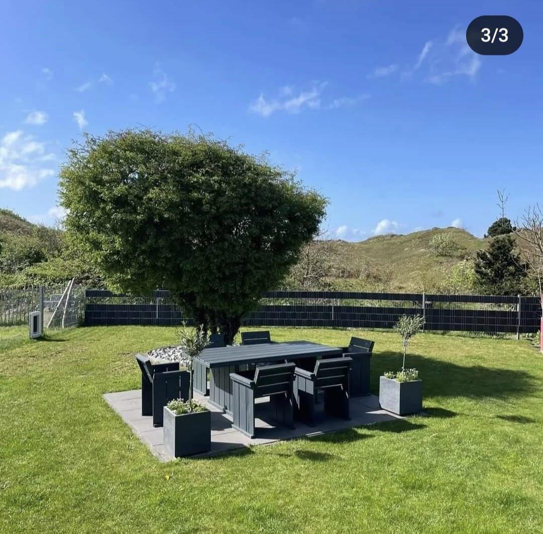 Gaskamin, Terrasse und eingezäunter Garten mit Lounge-Möbeln und Blick auf die Dünen