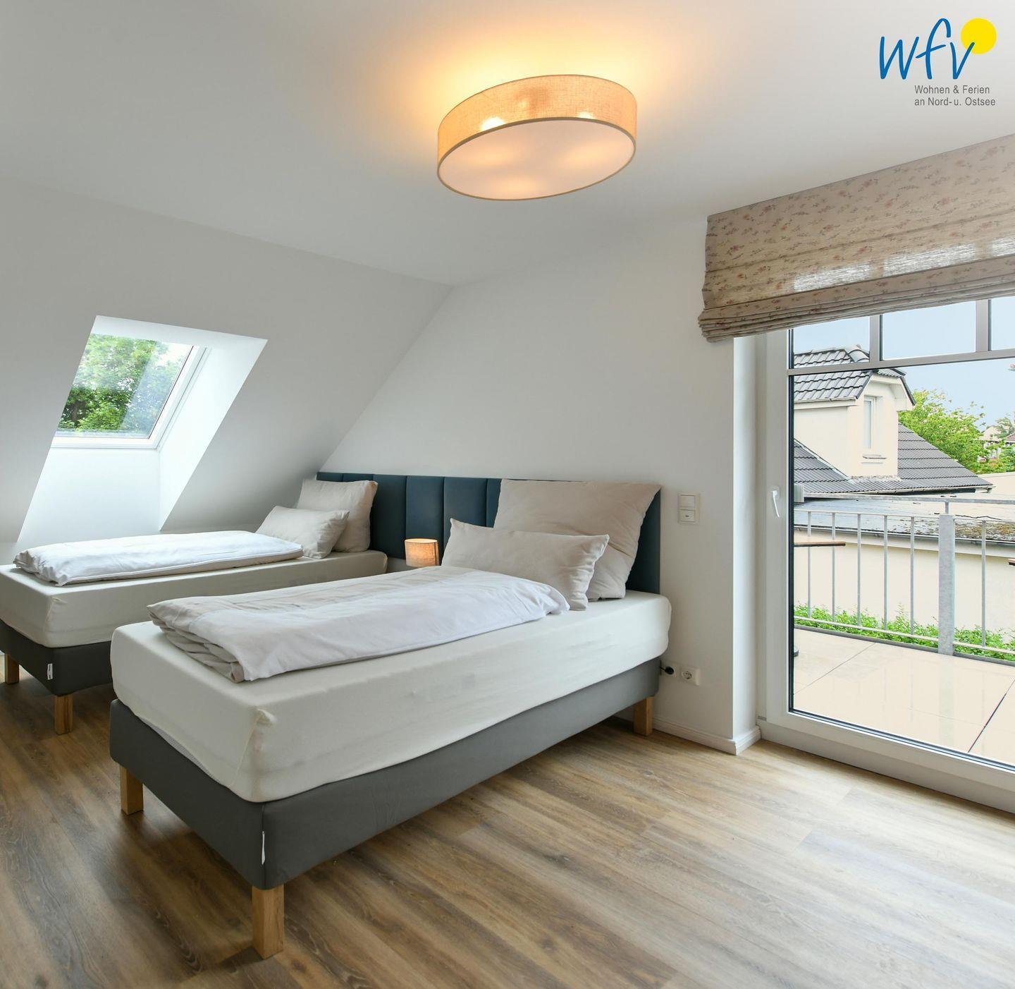Die zwei separaten Schlafzimmer (EG + DG) bieten Ihnen sowohl Komfort, als auch Privatsphäre. Ein Schlafzimmer ist mit einem komfortablen Kingsize-Boxspringbett ausgestattet, das zweite Schlafzimmer beinhaltet zwei Einzelbetten, die bei Bedarf auch zusammengeschoben werden können.