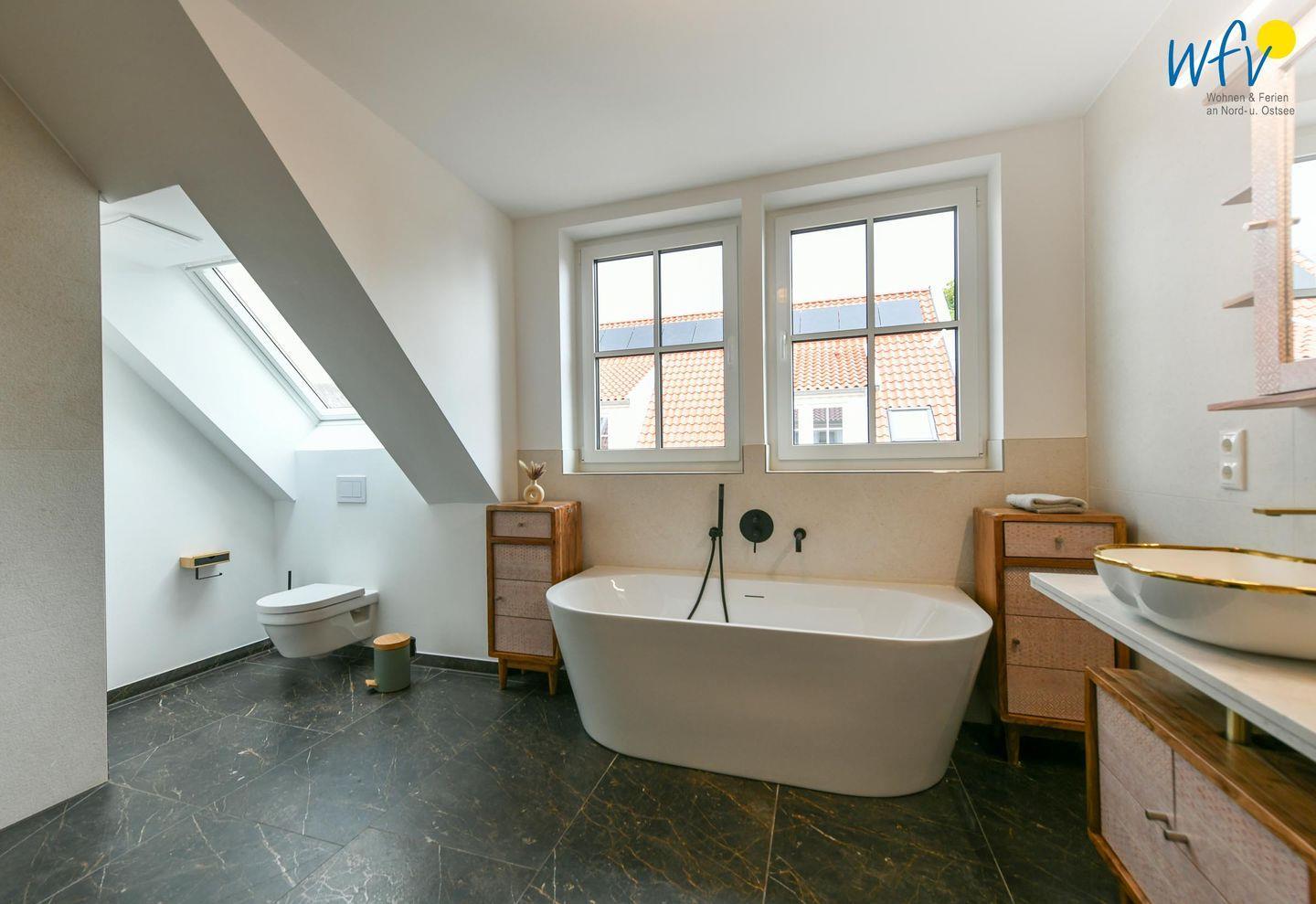 Zwei elegante Tageslichtbäder (EG + DG) sorgen für angenehme Ausweichmöglichkeiten. In dem Bad mit Dusche, Badewanne und eigener Sauna genießen Sie wohltuende Entspannungszeit.