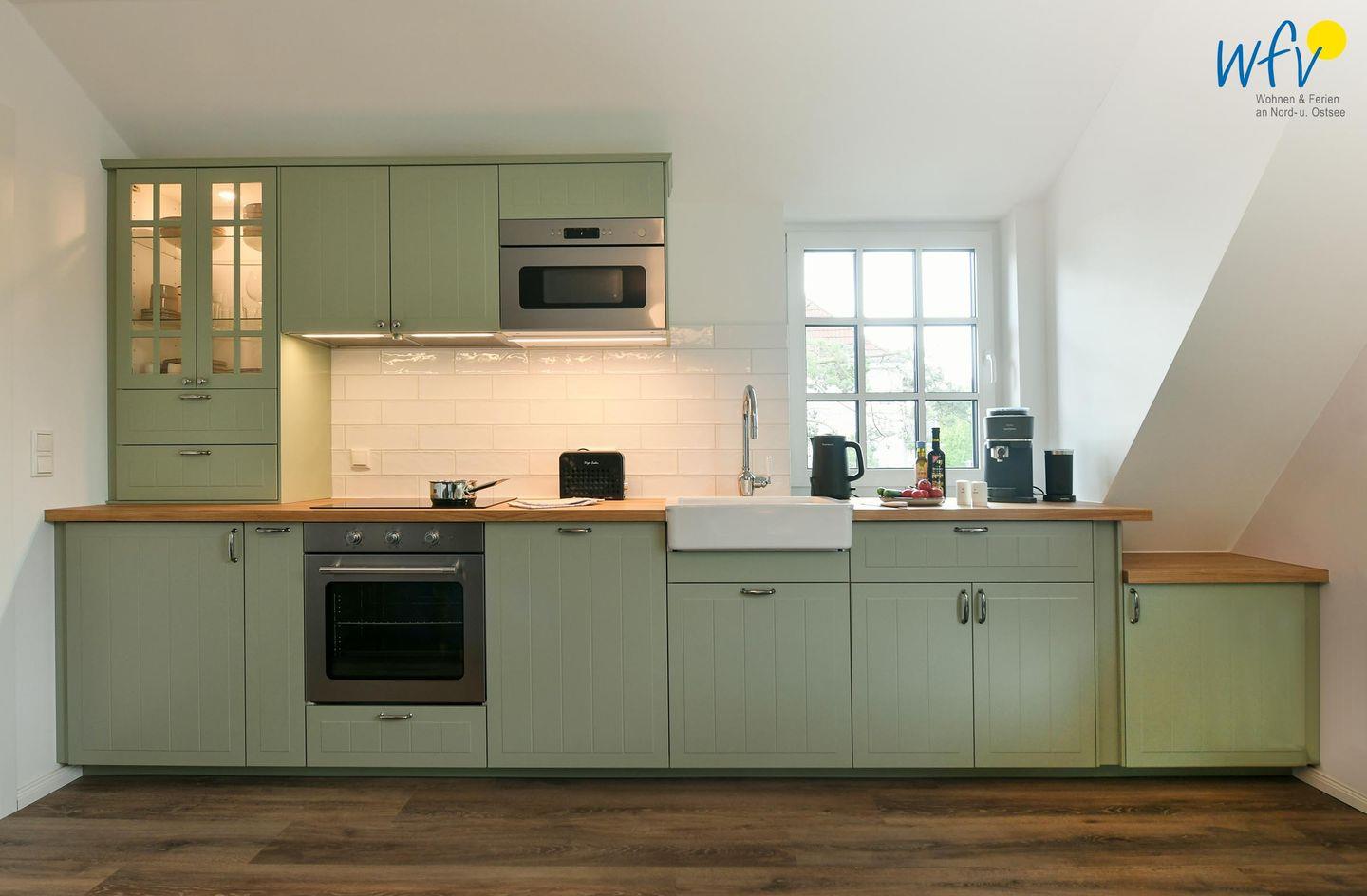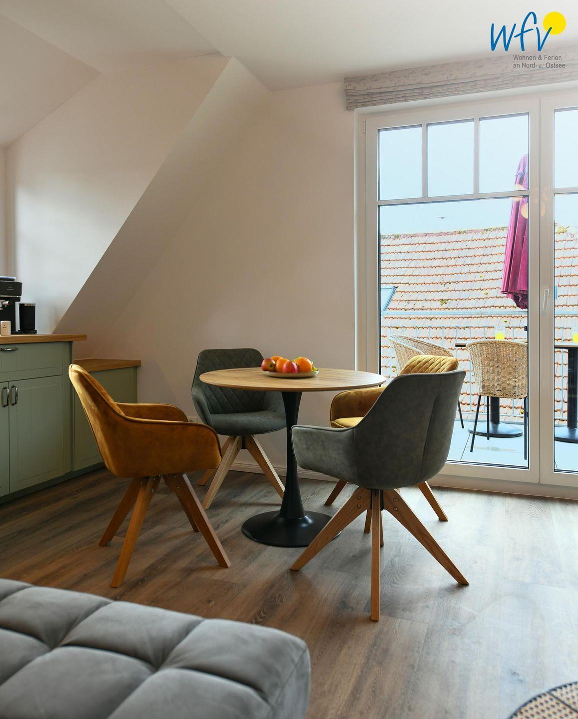 Die Maisonette-Ferienwohnung verfügt über ein modernes, offenes Wohnkonzept über zwei Etagen, das für ein weites Raumgefühl sorgt. Im Dachgeschoss sind Wohnbereich und Küche harmonisch miteinander verbunden, sodass Sie hier nach dem Strandtag oder der Fahrradtour gemütliche Abende auf dem bequemen Sofa verbringen, fernsehen und lesen können oder das gemeinsame Kochen genießen. Für kulinarische Erlebnisse ist die moderne Küche mit einem 4-Platten-Induktionsherd, einem Backofen, einer Mikrowelle, einem Kühlschrank mit Gefrierfach sowie einer Spülmaschine ausgestattet. Der angrenzende Wohnbereich lädt zu gemeinsamen Mahlzeiten ein.