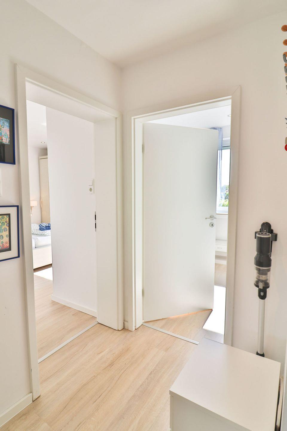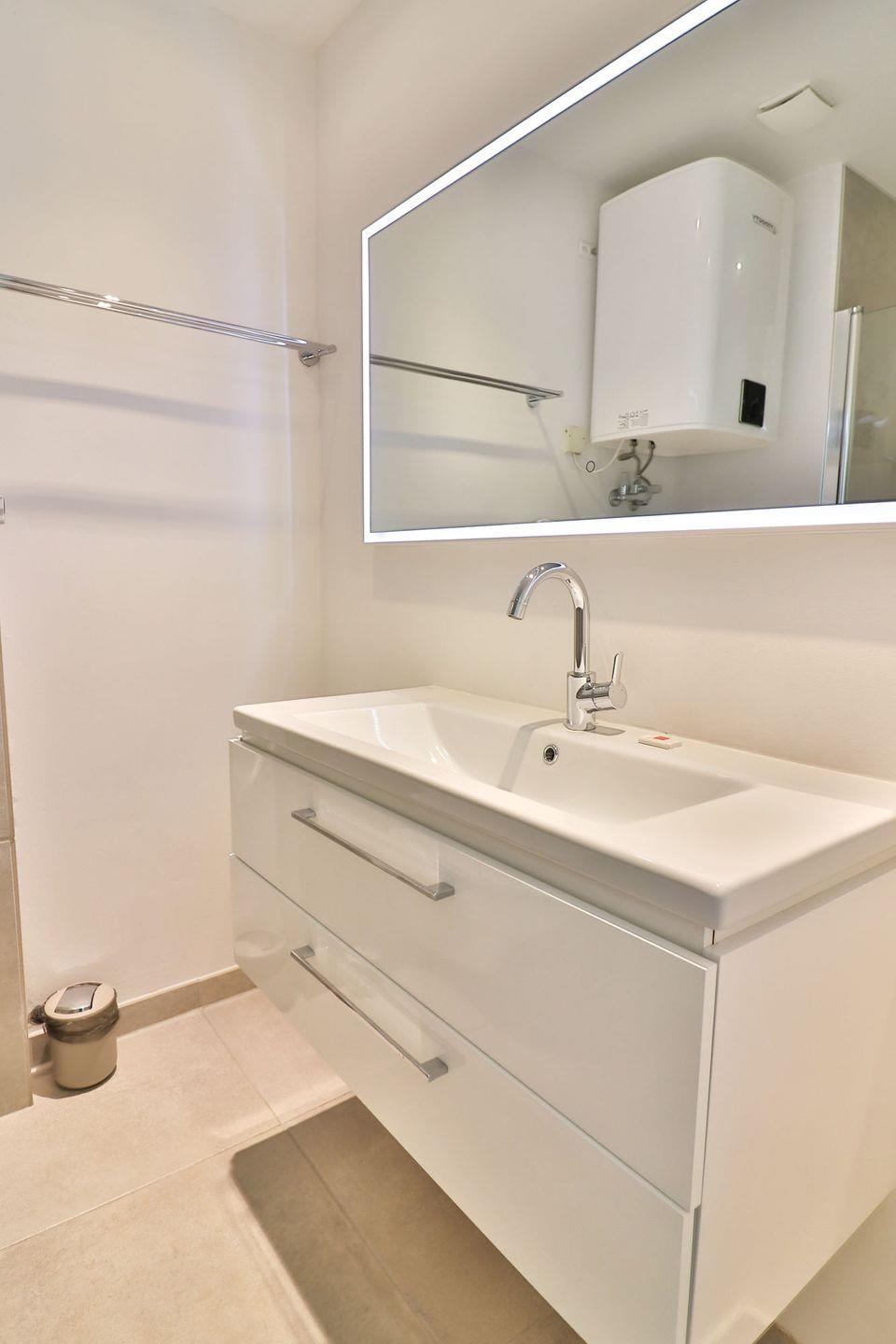 Das Badezimmer der Wohnung ist mit einer bodengleichen Dusche, Waschbecken, WC, Haartrockner und Spiegel funktional und modern ausgestattet. Zudem können Sie Waschmaschine und Trockner im Hausflur gemeinschaftlich nutzen. Auch ein Wäscheständer steht bereit.