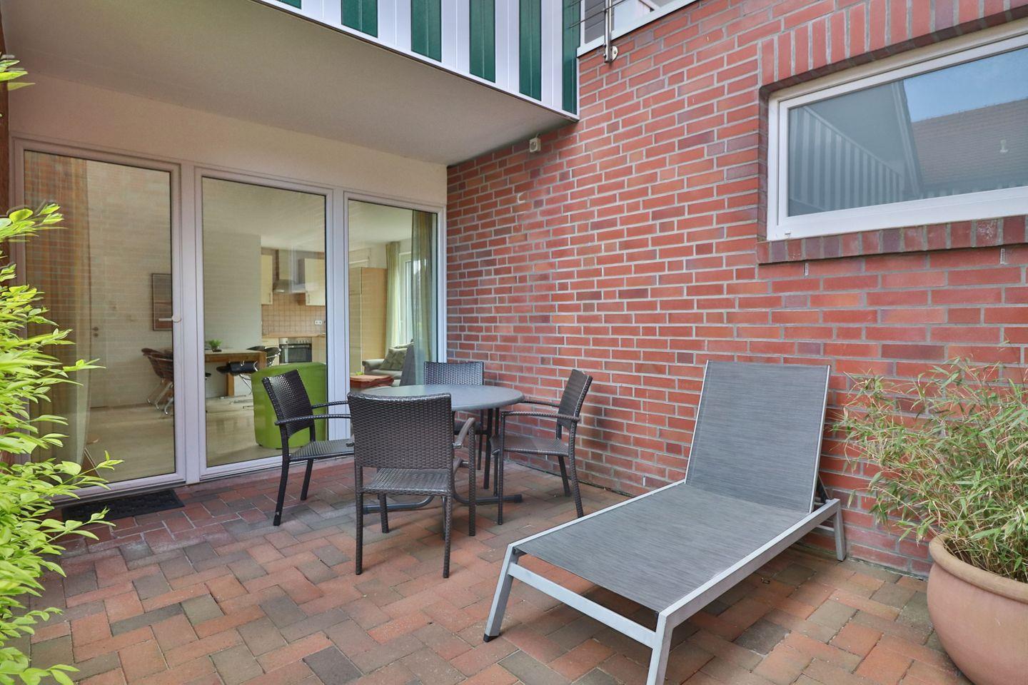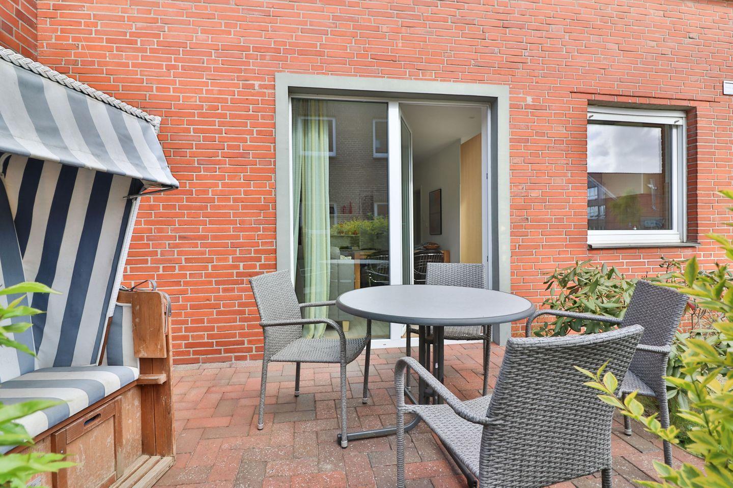 Zwei großzügige, möblierte Terrassen laden mit Gartenmöbeln, Sonnenliegen und einem eigenen Strandkorb zum Verweilen im Freien ein – perfekt, um frische Nordseeluft zu genießen oder einen entspannten Nachmittag in privater Atmosphäre zu verbringen.