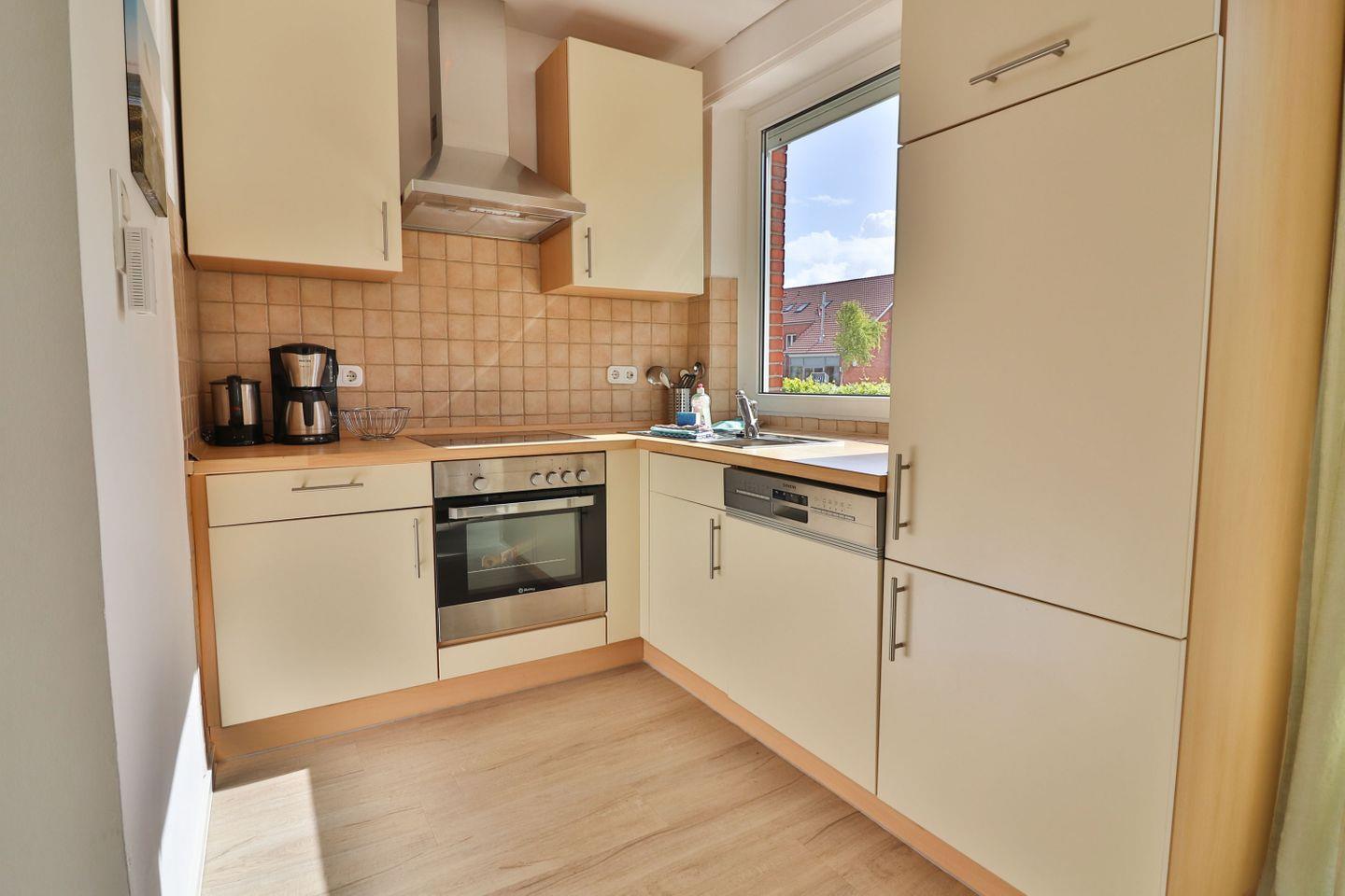 Die offene Küche grenzt direkt an das Wohnzimmer und ist mit sämtlichen benötigten Geräten und Utensilien ausgestattet: Sie finden einen Ceranherd, Backofen, Kühlschrank, Spülmaschine, Toaster, Kaffeemaschine, Wasserkocher und sämtliche Küchenutensilien sowie ausreichend Geschirr und Besteck.