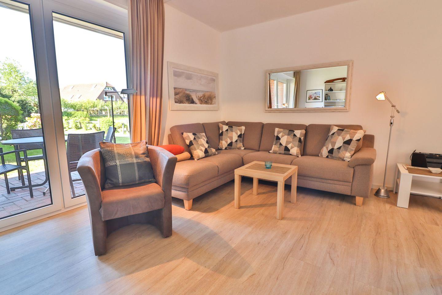 Ein besonderes Highlight dieser Wohnung ist die überdachte Terrasse mit Gartenmöbeln und direktem Zugang zum Garten hinter dem Haus, der zum Verweilen im Freien einlädt und entspannte Momente bei schönem Inselwetter bietet.