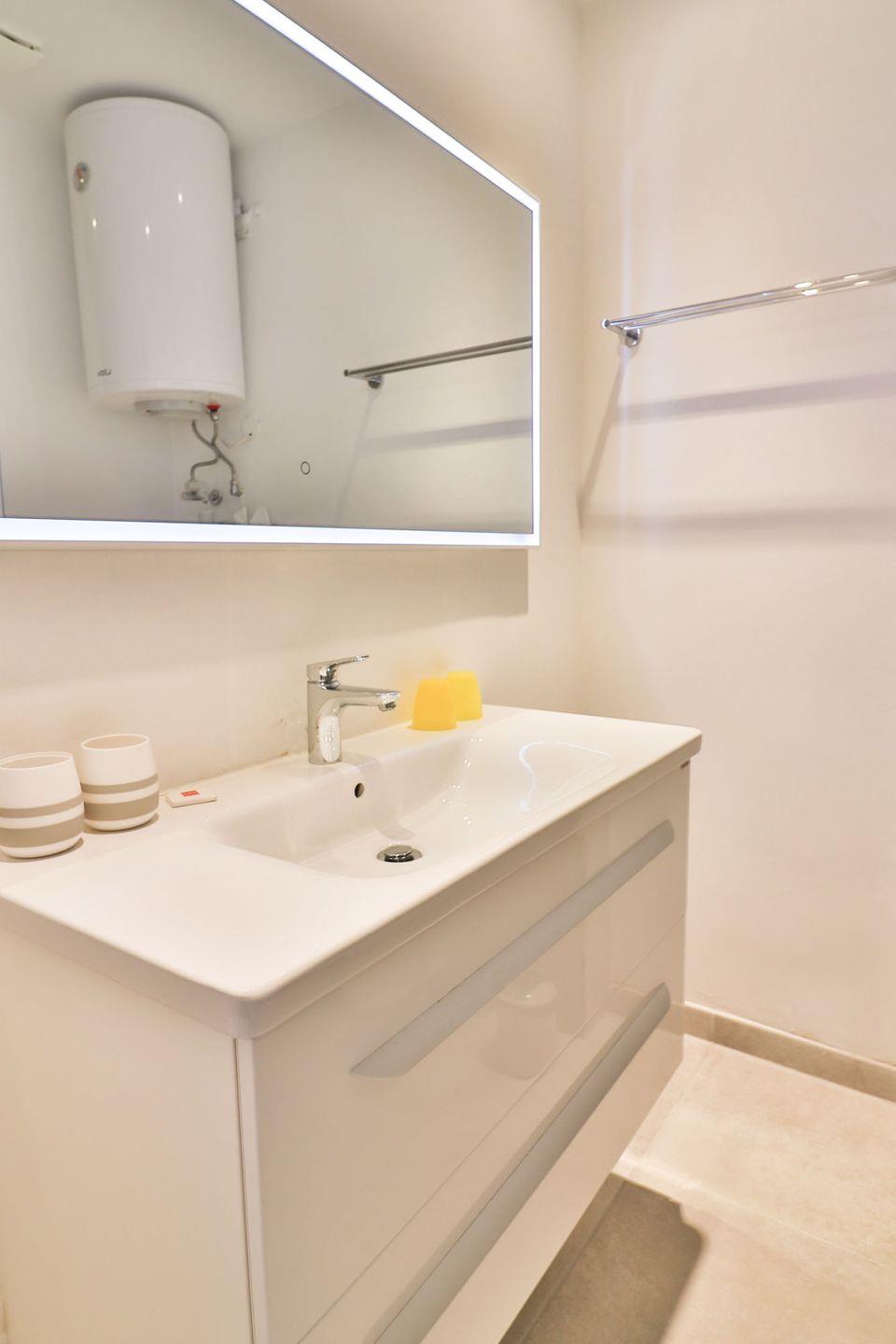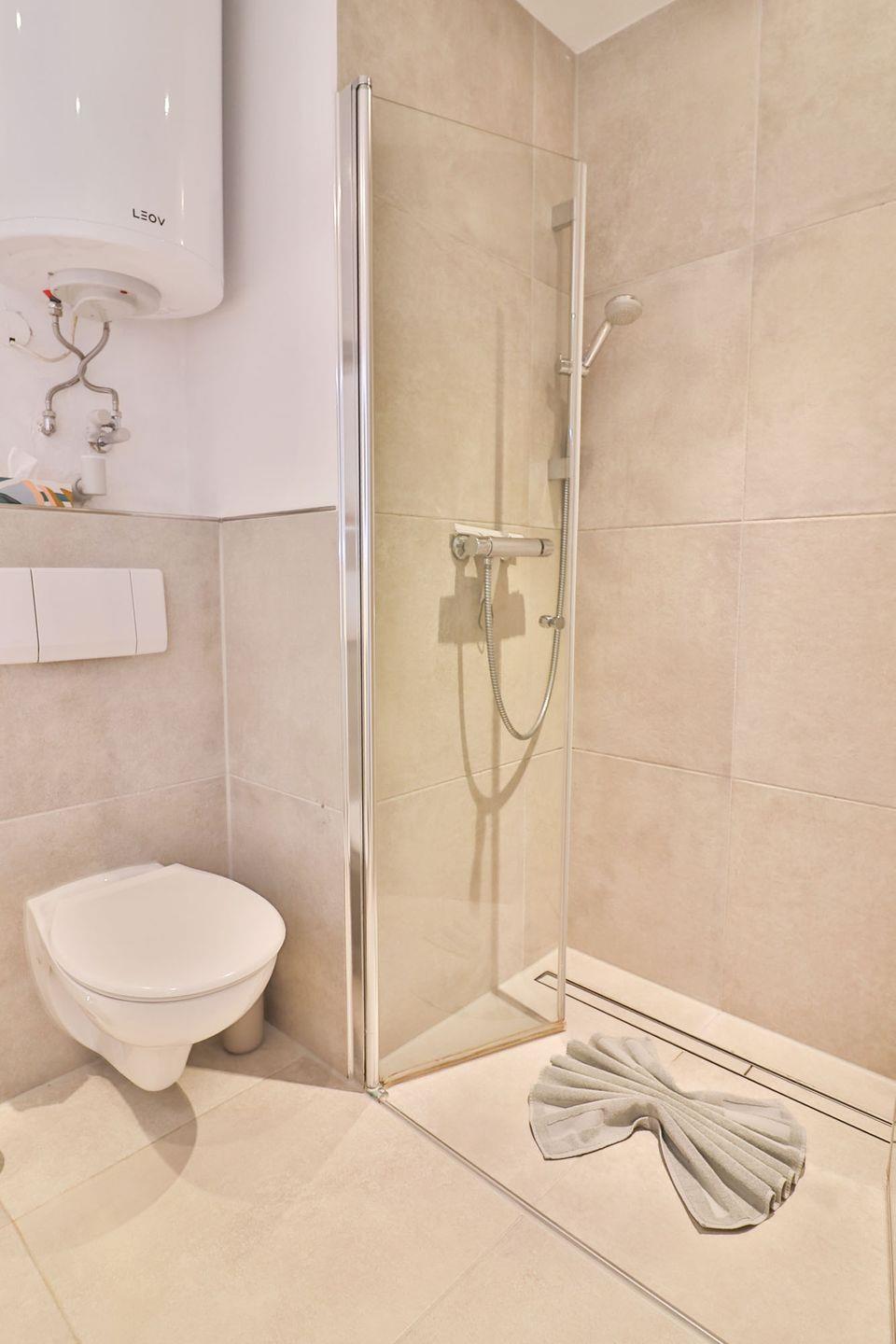 Das moderne Badezimmer ist hell und verfügt über eine bodengleiche Dusche, Waschbecken, Haartrockner, Spiegel und WC.