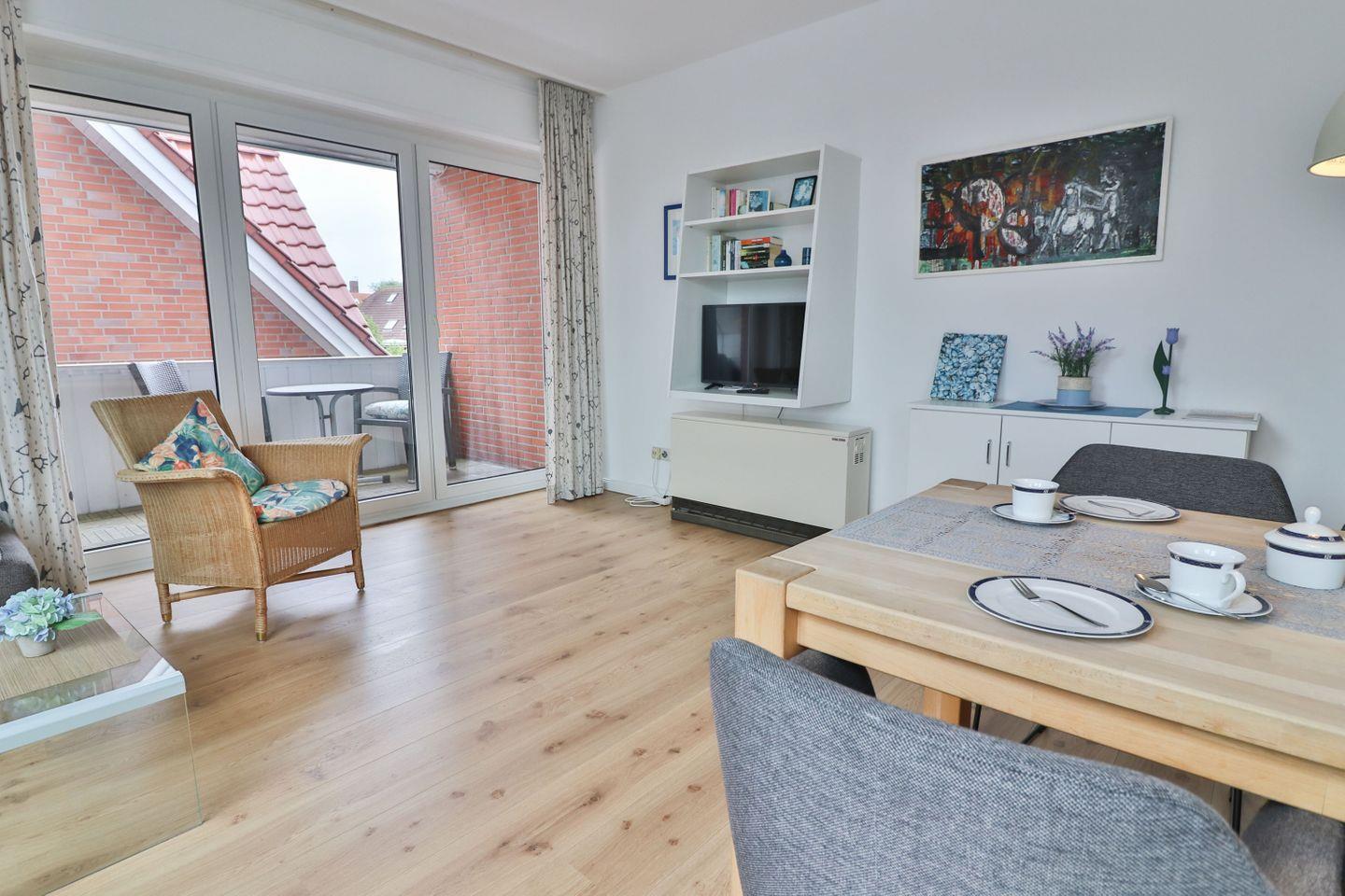 Der zum Teil überdachte Balkon ist mit Gartenmöbeln und Sonnenliegen ausgestattet und bietet Ihnen die Möglichkeit, die frische Nordseeluft zu genießen – unabhängig vom Wetter. Ob Sie morgens in Ruhe frühstücken oder abends entspannen möchten, der Balkon ist ein Rückzugsort im Freien.