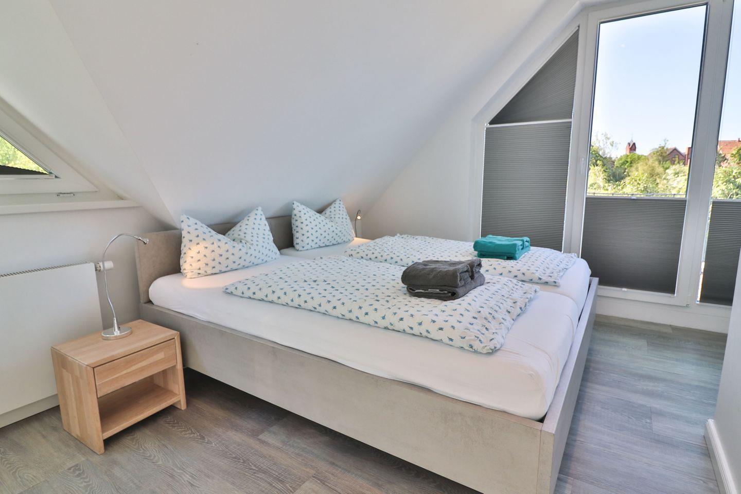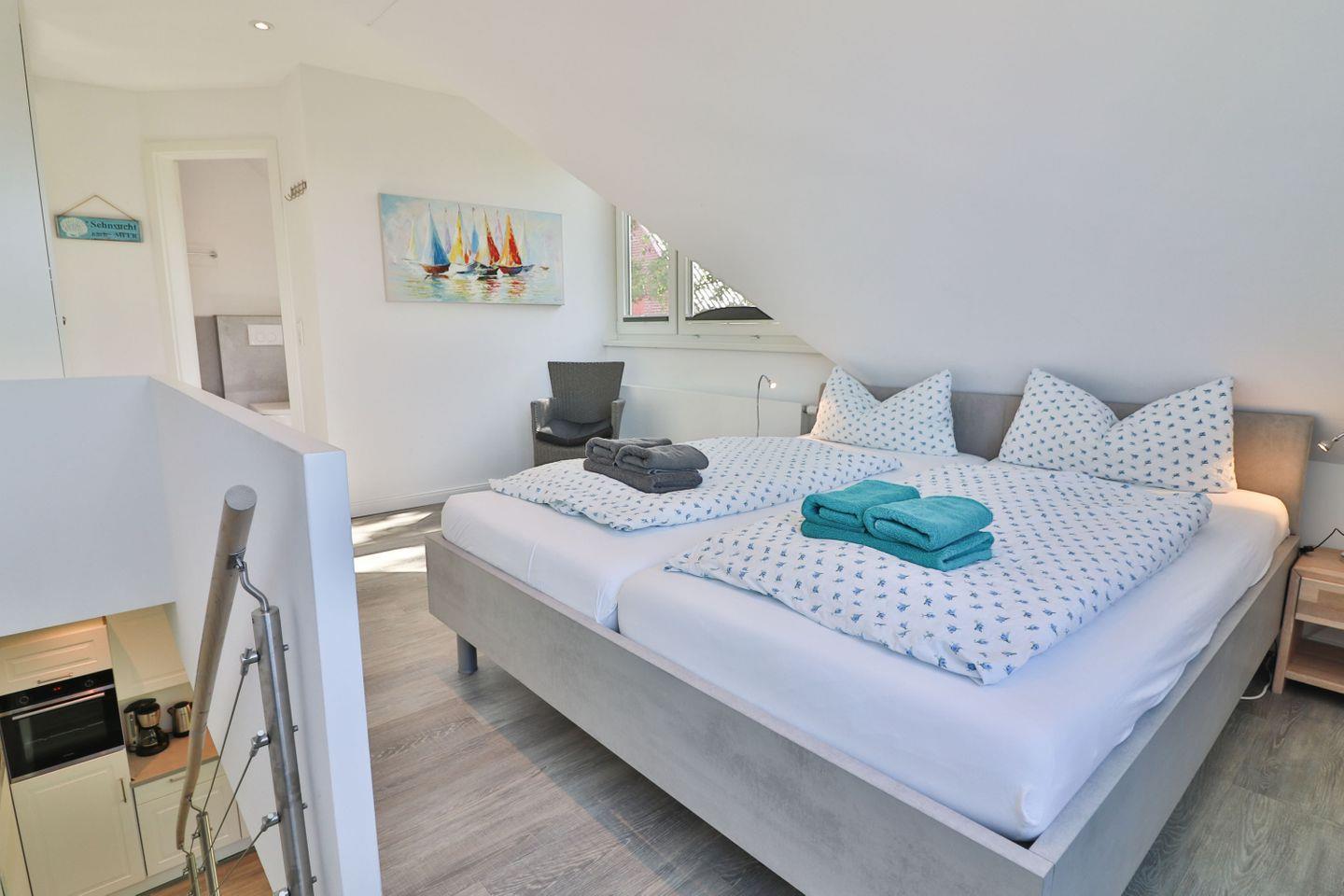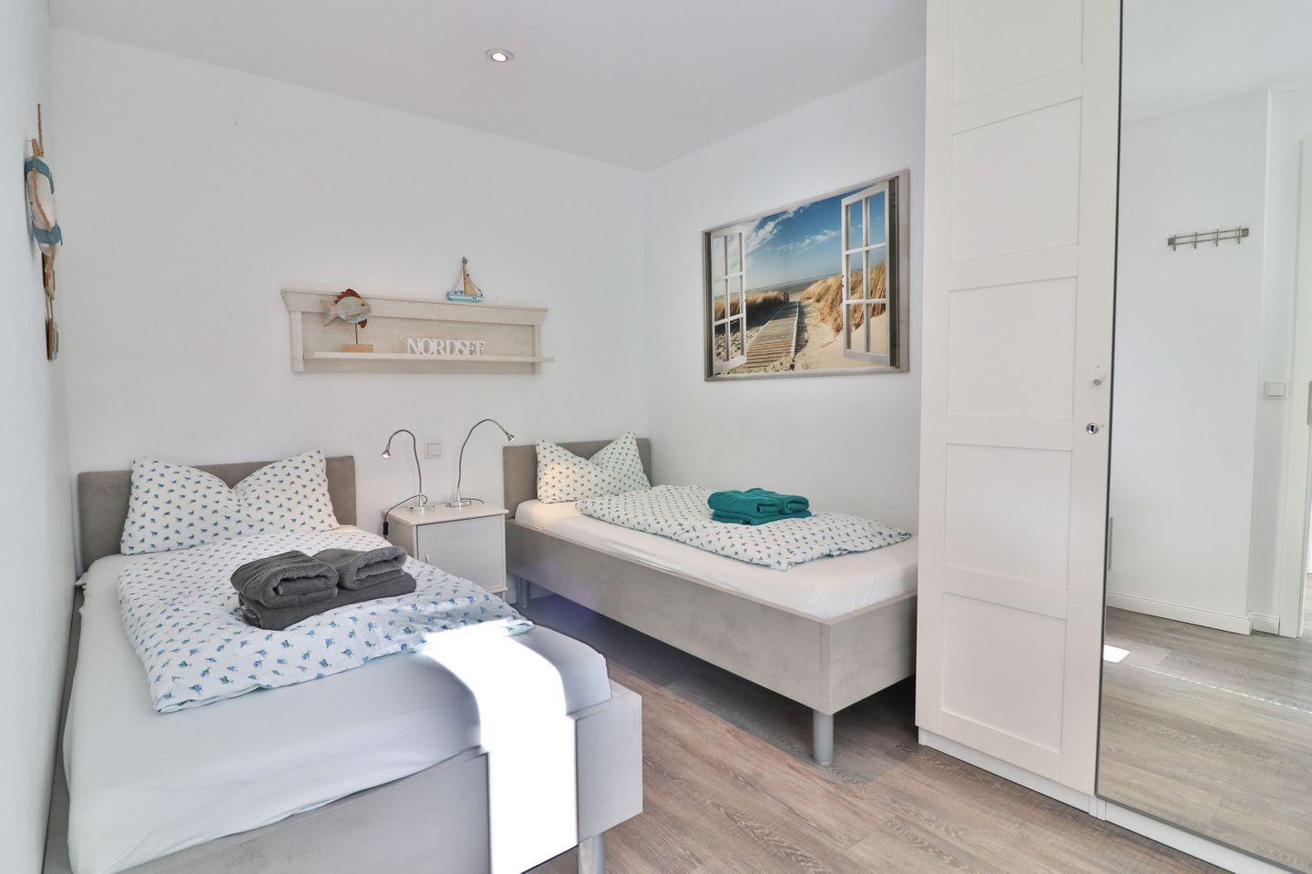 Die Ferienwohnung verfügt über zwei Schlafzimmer: Im Erdgeschoss befindet sich ein Schlafzimmer mit zwei Einzelbetten und Kleiderschrank – ideal für Kinder oder Freunde. Über eine offene Treppe gelangen Sie ins Obergeschoss, wo sich ein weiteres Schlafzimmer mit einem gemütlichen Doppelbett befindet. Beide Etagen sind jeweils mit einem eigenen, modernen Badezimmer ausgestattet. Die Bäder verfügen über bodengleiche Duschen, WC und Waschbecken, im oberen Bad steht Ihnen zusätzlich eine eigene Waschmaschine zur Verfügung – ideal auch für längere Aufenthalte.