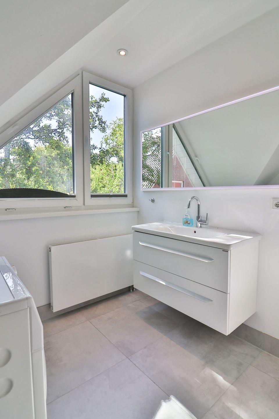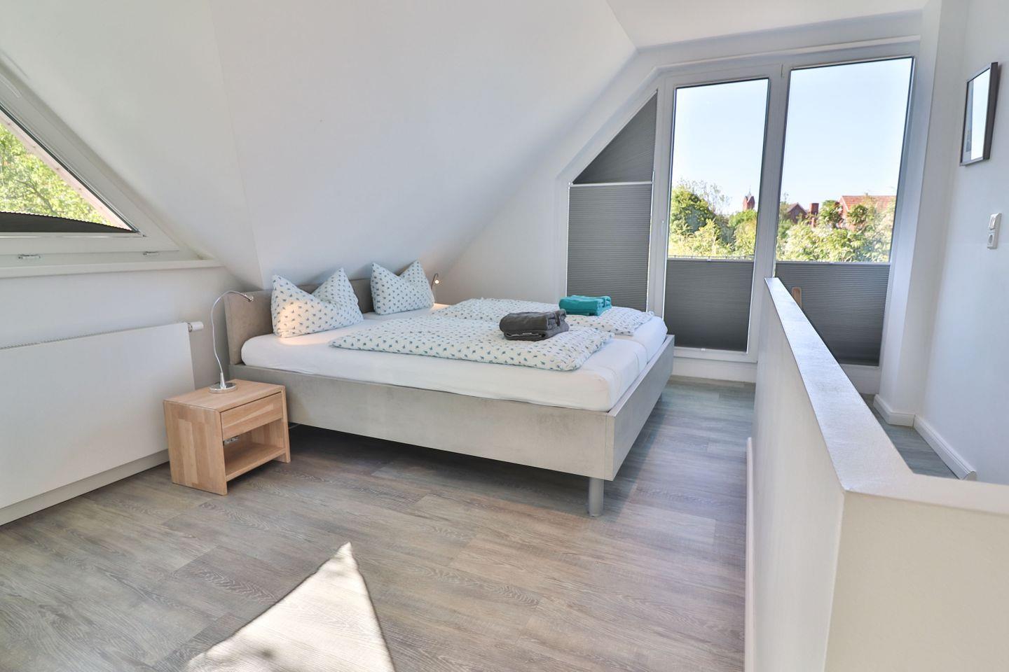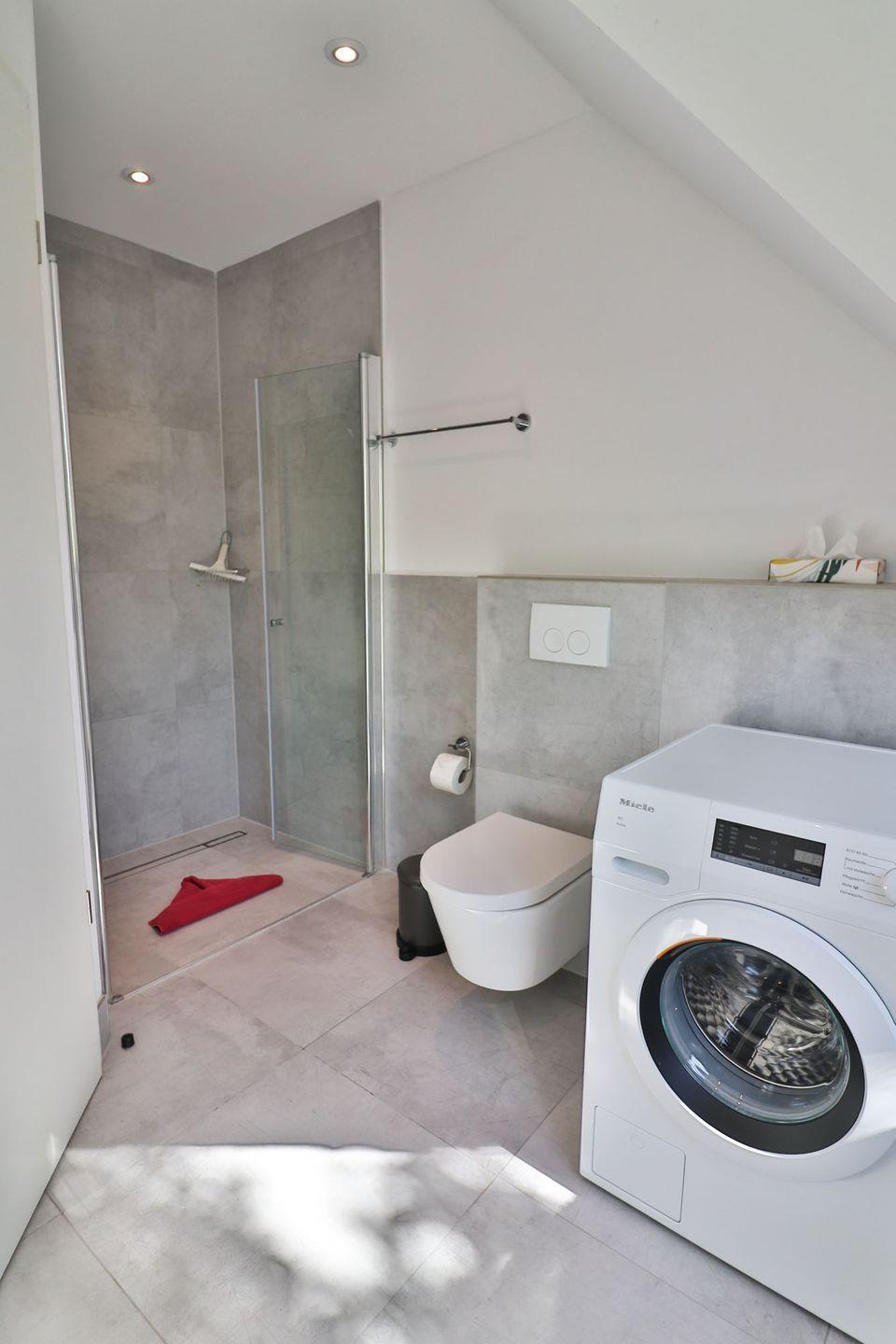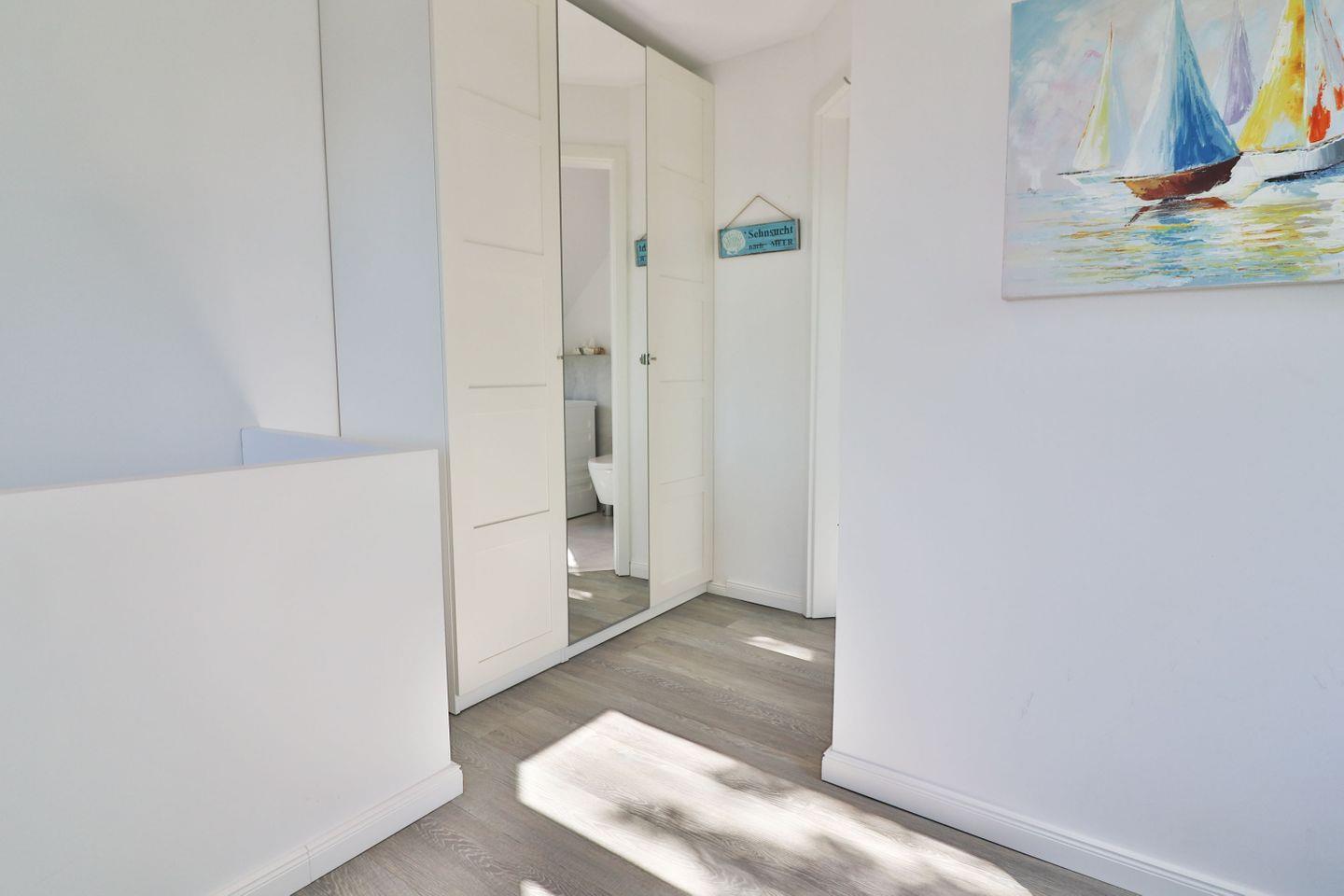 Die Ferienwohnung verfügt über zwei Schlafzimmer: Im Erdgeschoss befindet sich ein Schlafzimmer mit zwei Einzelbetten und Kleiderschrank – ideal für Kinder oder Freunde. Über eine offene Treppe gelangen Sie ins Obergeschoss, wo sich ein weiteres Schlafzimmer mit einem gemütlichen Doppelbett befindet. Beide Etagen sind jeweils mit einem eigenen, modernen Badezimmer ausgestattet. Die Bäder verfügen über bodengleiche Duschen, WC und Waschbecken, im oberen Bad steht Ihnen zusätzlich eine eigene Waschmaschine zur Verfügung – ideal auch für längere Aufenthalte.
