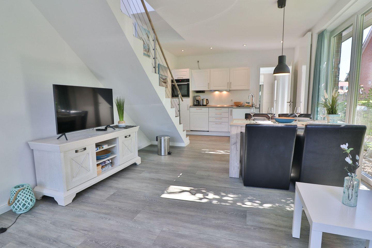 Im Erdgeschoss erwartet Sie ein großzügiges, lichtdurchflutetes Wohn- und Esszimmer mit einer großen Fensterfront, die den Blick in den ruhig gelegenen Garten auf der Rückseite des Hauses freigibt. Von hier aus gelangen Sie direkt auf die möblierte Terrasse mit Tisch, Stühlen und einem Strandkorb – der perfekte Ort für entspannte Stunden im Freien. Der Wohnbereich bietet ein komfortables Sofa, einen Fernseher und lädt zum Ausruhen nach einem Strandspaziergang oder Inselausflug ein. Der angrenzende Essbereich schafft eine gemütliche Atmosphäre für gemeinsame Mahlzeiten, Spieleabende oder geselliges Beisammensein.