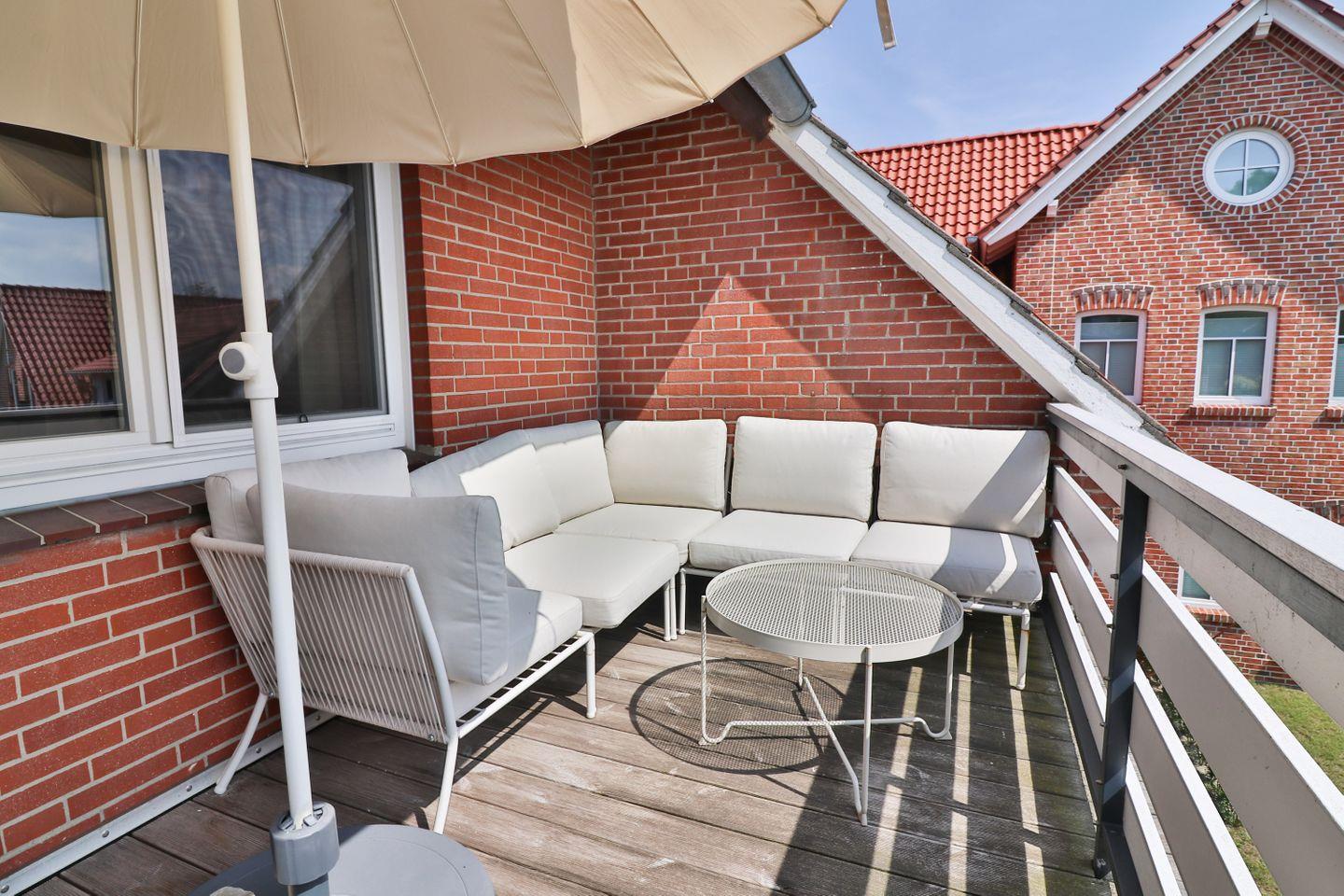 Ein besonderes Highlight ist der große Süd-Balkon, den Sie direkt vom Wohnungsflur aus betreten. Hier laden ein Tisch, Stühle, Loungemöbel und ein Sonnenschirm zum Entspannen in der Sonne ein – ob beim Frühstück, Nachmittagskaffee oder einem Glas Wein am Abend.
