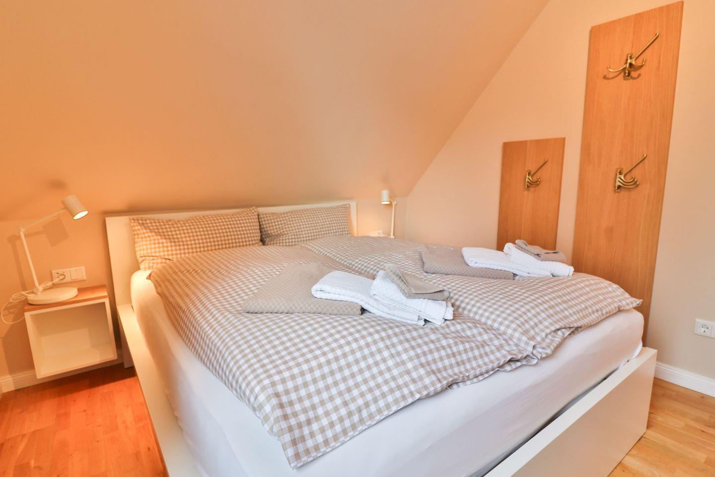 Die drei Schlafzimmer sind mit komfortablen Doppelbetten (zweimal 180x200 cm, einmal 160x200 cm), Kleiderschränken und Verdunkelungsvorhängen ausgestattet. Zwei der Zimmer verfügen zusätzlich über einen eigenen Fernseher. Eines der Schlafzimmer ist ein Durchgangszimmer zum dritten Schlafzimmer – ideal für Familien mit Kindern oder enge Freunde.
