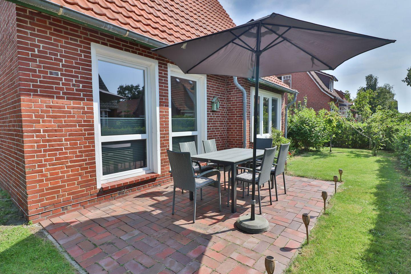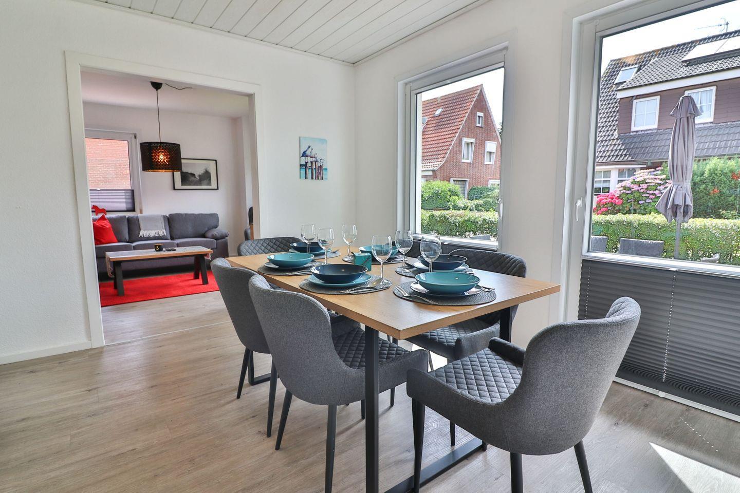 Die Maisonette-Wohnung erstreckt sich über zwei Etagen und verbindet modernen Komfort mit einer behaglichen Atmosphäre. Im Erdgeschoss erwartet Sie ein einladendes Wohnzimmer mit Fernseher – perfekt für entspannte Abende. Die voll ausgestattete Küche mit Herd, Mikrowelle, Spülmaschine, Kühlschrank, Kaffeemaschine, Senseo-Kaffeemaschine, Wasserkocher und Toaster lässt keine Wünsche offen. Direkt angrenzend befindet sich der helle Essbereich, von dem aus Sie Zugang zur möblierten Terrasse mit Tisch, Stühlen und Sonnenschirm haben – ideal für ein Frühstück an der frischen Nordseeluft.