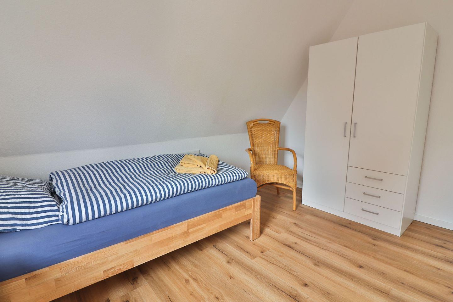 Im Obergeschoss erwarten Sie drei weitere Schlafzimmer: zwei mit je einem Einzelbett (90?x?200?cm) und Stauraum in Kleiderschrank oder Kommode, sowie ein großzügiges Schlafzimmer mit einem Doppelbett (180?x?200?cm) und Kleiderschrank. Ein zweites Badezimmer mit Dusche, WC und Waschbecken sorgt für zusätzlichen Komfort.