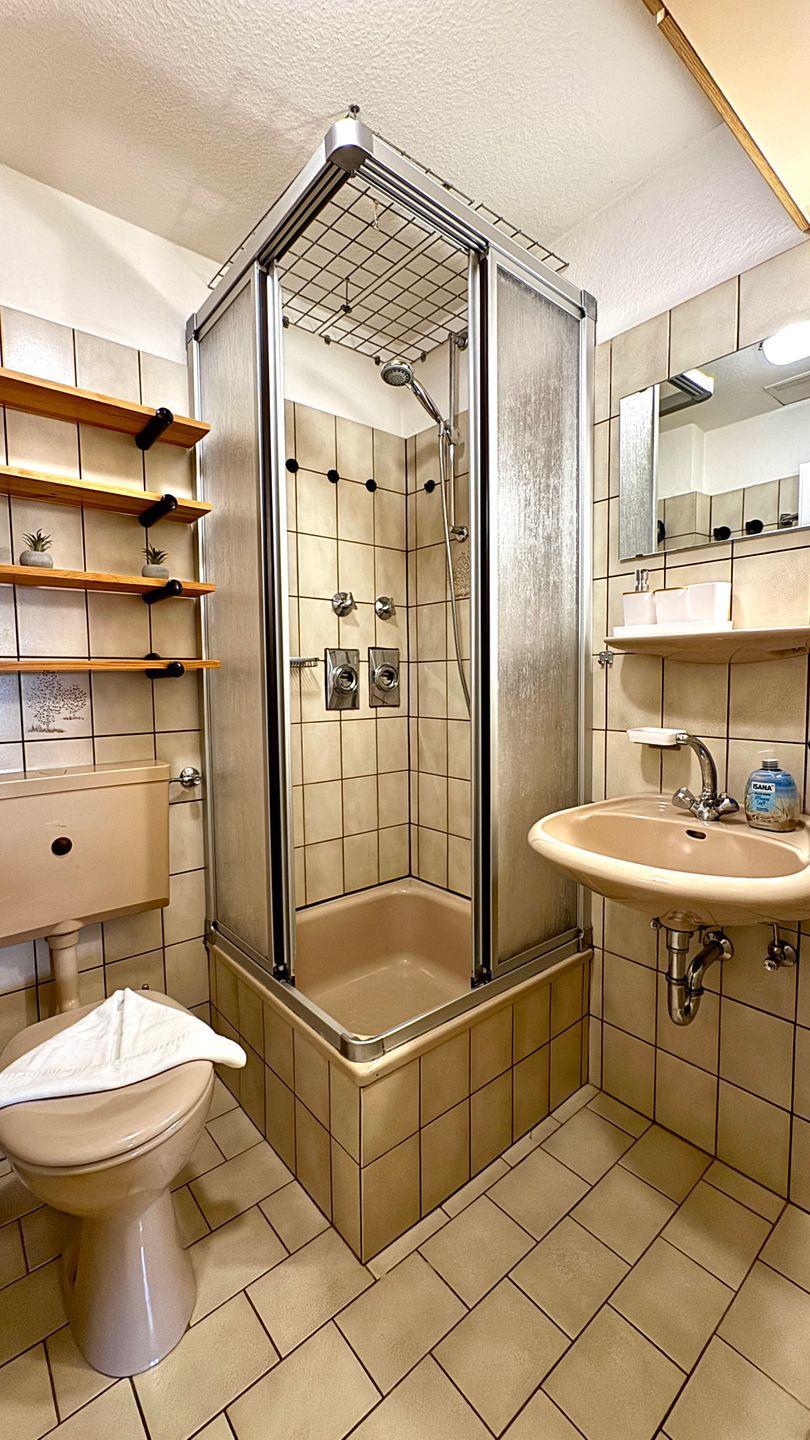 Der Eingangsbereich der MUSCHEL führt rechts in die kleine funktionstüchtige Küchenecke - geradeaus ins Duschbad mit Waschtisch und WC.