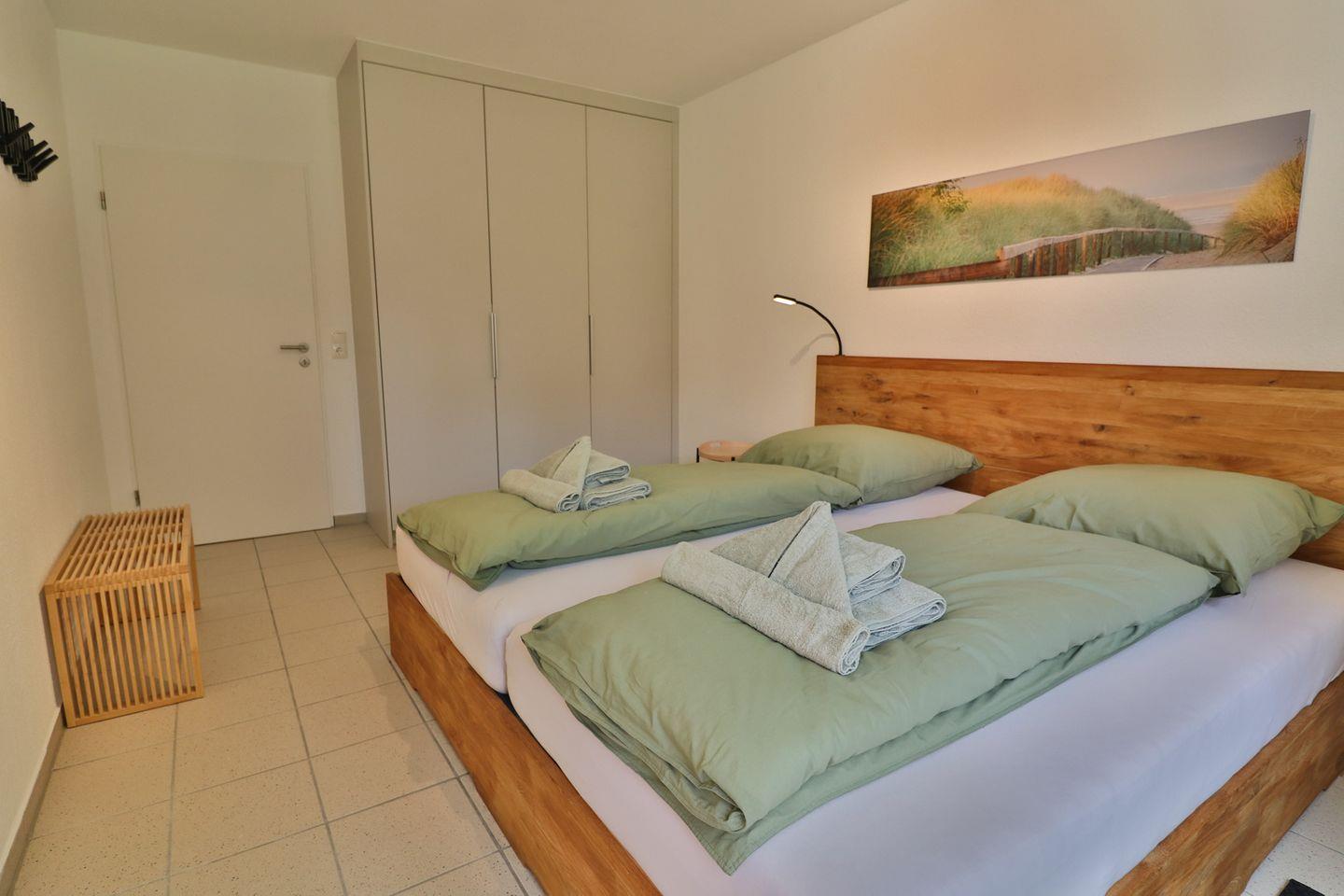 Das Schlafzimmer ist mit einem gemütlichen Doppelbett (200 x 200 cm), einem großzügigen Kleiderschrank und zusätzlichen Kleiderhaken an der Wand möbliert. Vom Schlafzimmer aus gibt es einen zweiten Zugang zur Terrasse.