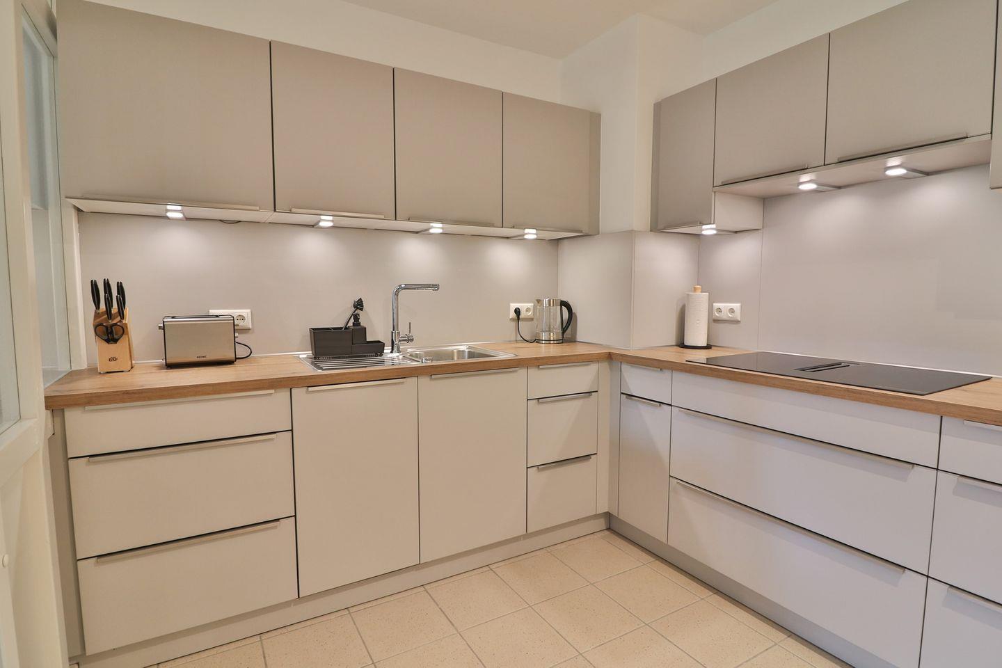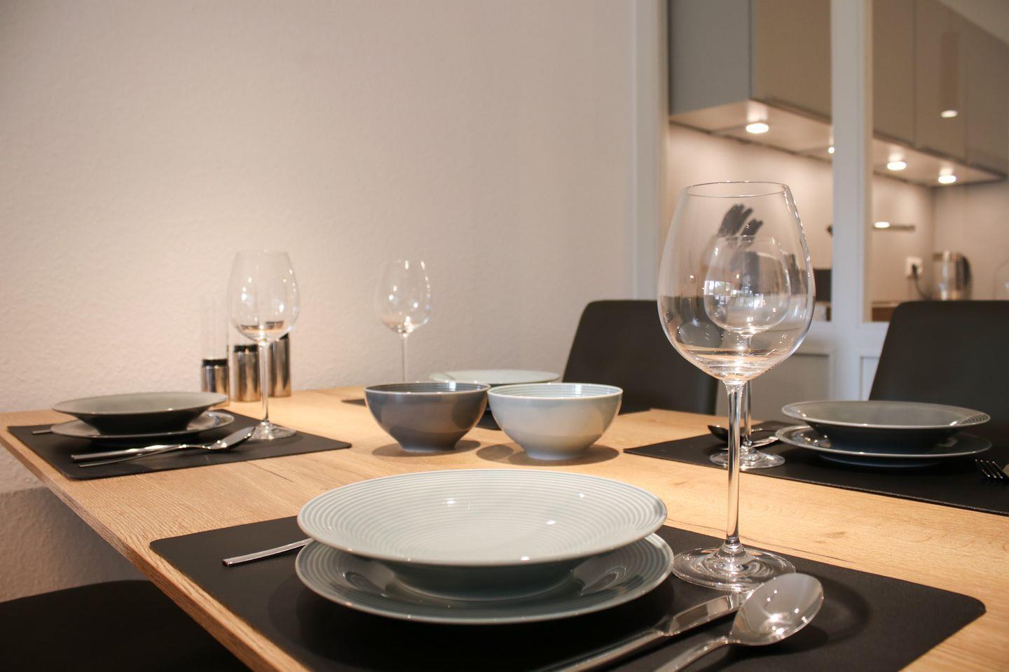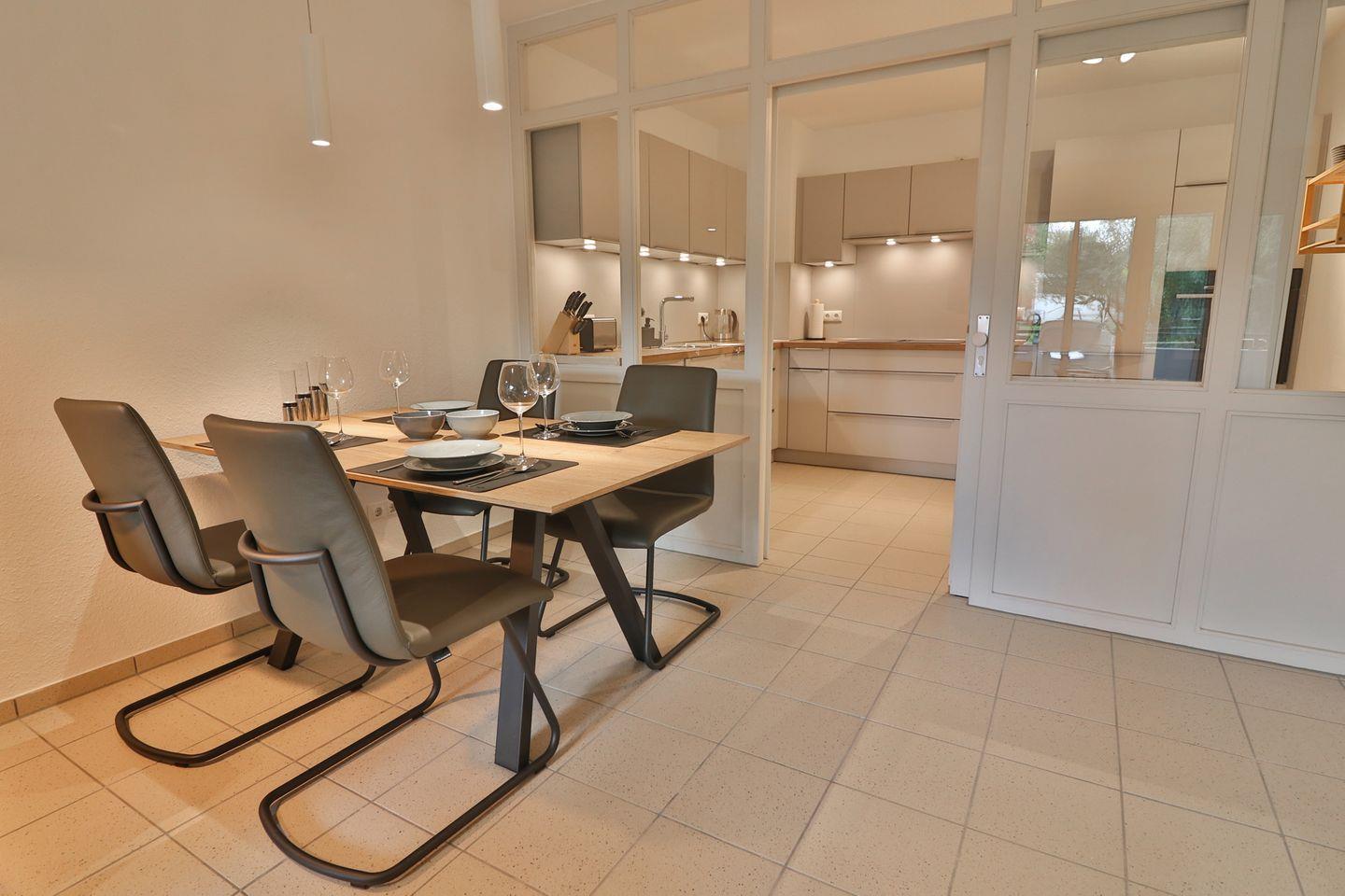 Im großzügig geschnittenen Wohnzimmer stehen Ihnen eine Sofaecke mit (Schlaf-)Sofa (160 x 190 cm) und Sessel, ein TV sowie ein Essbereich mit Esstisch zur Verfügung. Für gemütliche Lesestunden oder gesellige Abende sorgen bereitgestellte Bücher und Spiele. Die abgeschlossene, großzügige Küche ist modern ausgestattet: Neben einem Induktionsherd und Backofen finden Sie einen Kühlschrank inklusive Gefrierfach, eine Spülmaschine, Mikrowelle, Wasserkocher, Toaster sowie sämtliche Küchenutensilien, Geschirr und Besteck vor.