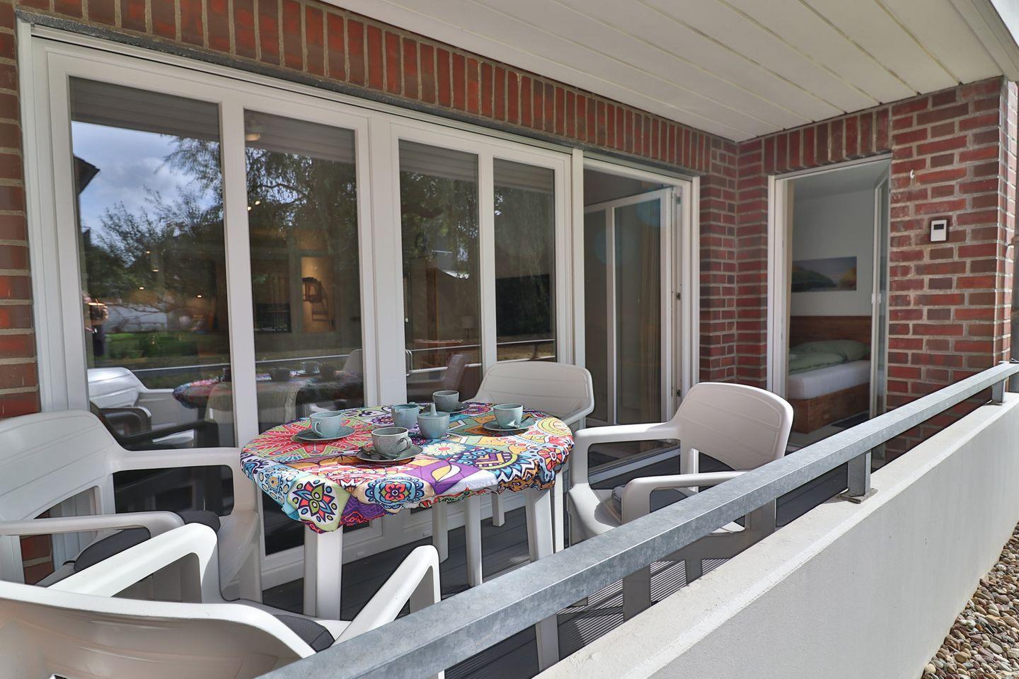 Eines der besonderen Highlights der Wohnung ist die überdachte und geschlossene Terrasse, die allen Gästen, die Wert auf Privatsphäre und Wetterschutz legen, sehr entgegenkommt. Der Gartenbereich vor der Terrasse kann ebenfalls genutzt werden und lädt zu entspannten Stunden im Freien ein.