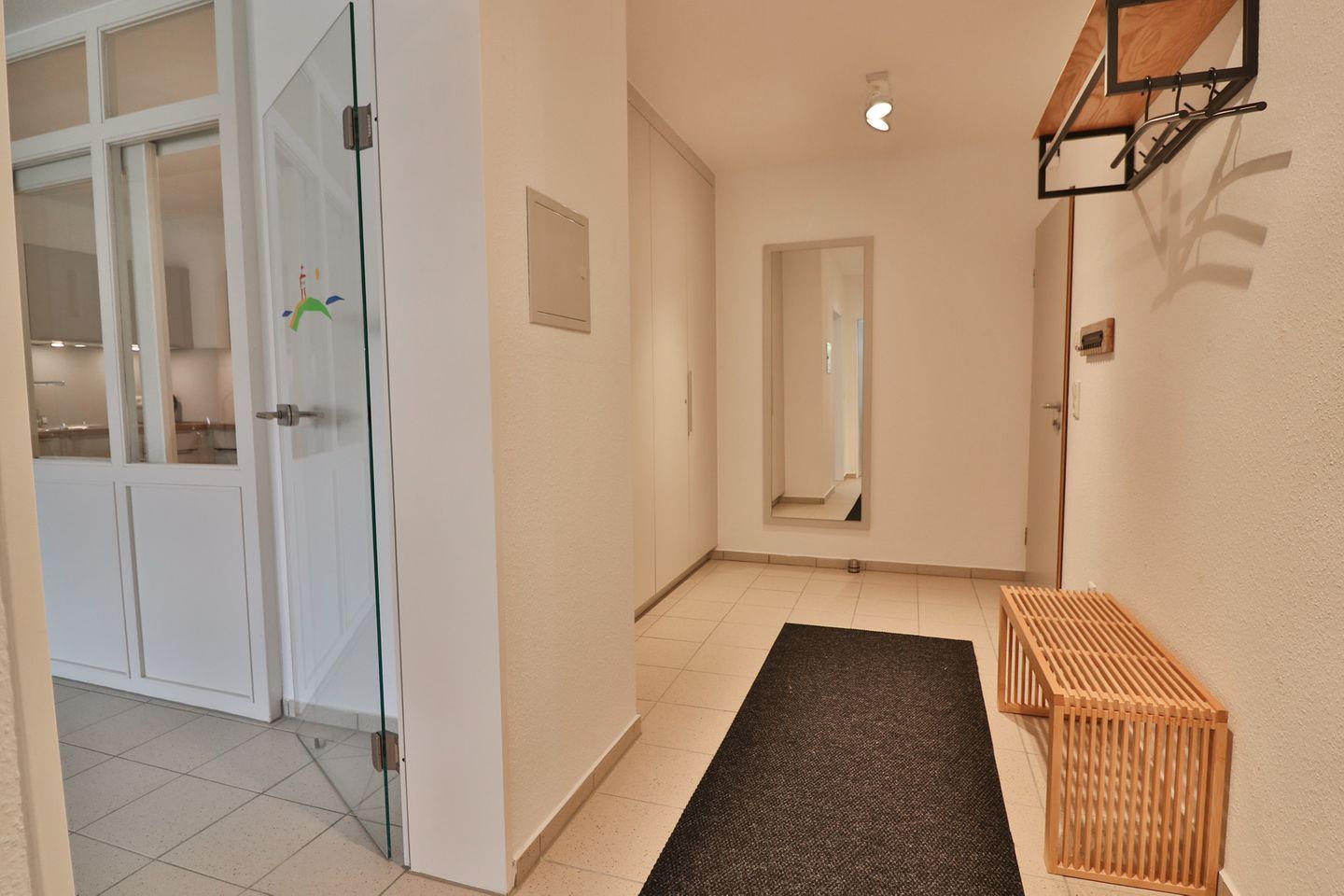 Zur weiteren Ausstattung gehören eine Waschmaschine und ein Trockner im Keller des Hauses, die gemeinschaftlich genutzt werden können. Die Wohnung verfügt zudem über elektrische Außenrollos und zusätzliche Vorhänge an allen Fenstern, sodass Sie sich zu jeder Zeit ungestört fühlen können.
