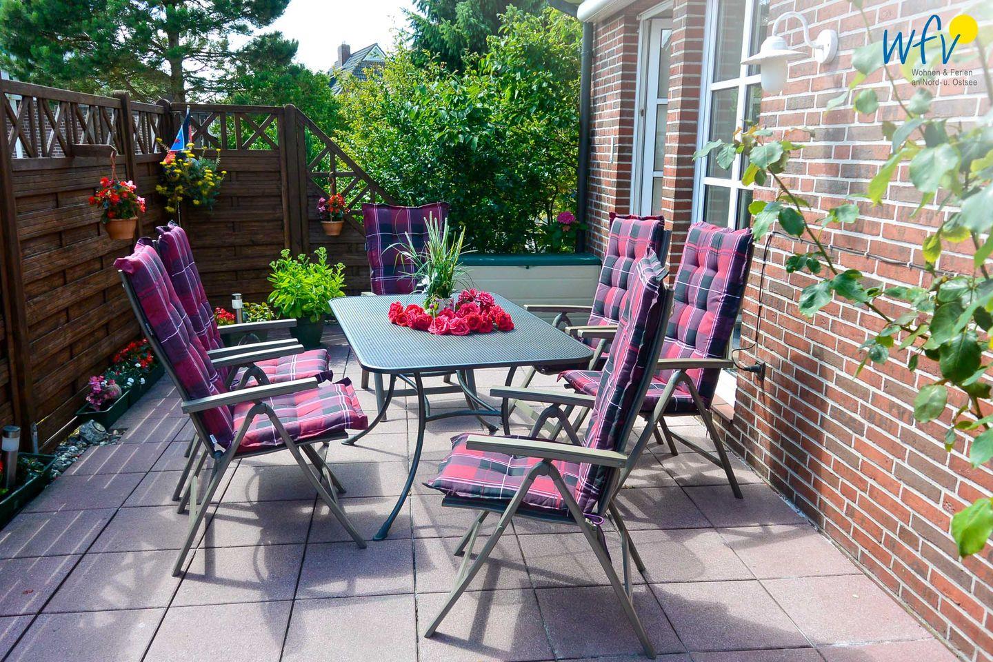 Auch nach dem Badeausflug kommen Sie weiterhin in den Genuss von frischer Nordseeluft: Vom Wohnraum aus gelangen Sie direkt auf die sonnige möblierte Süd-Terrasse mit Strandkorb. Hier in Ruhe eine gutes Buch zu lesen oder sich durch den Tag zu träumen bietet 100 % Erholung!