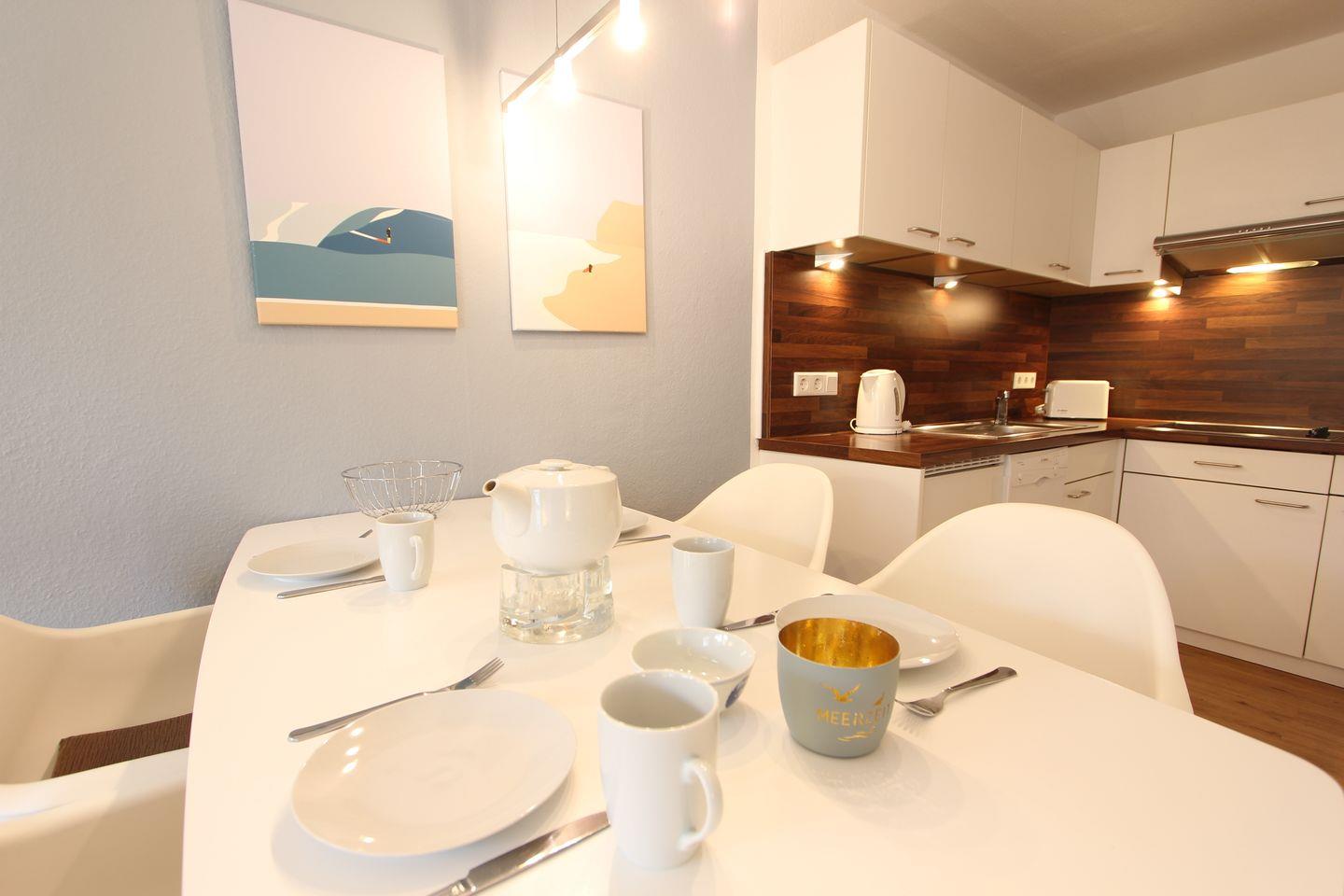 In dieser Wohnung finden Sie auf 47 Quadratmetern alles, was Sie für entspannte Tage allein oder zu dritt in Ihrem Inselurlaub auf Langeoog benötigen. Vom in warmen Erdtönen mit blauen Akzenten eingerichteten Wohn- und Esszimmer aus genießen Sie einen Blick auf die von Grün umgebene Terrasse. Auch die offene Küche in freundlichem weiß ist in diesen Raum integriert. Im Essbereich befindet sich ein großzügiger Essplatz für 4 Personen sowie eine gemütliche Sitzgarnitur mit Blick auf die kleine Terrasse. Die voll ausgestattete Küche bietet unter anderem Kaffeemaschine, Toaster, Geschirrspüler, Herd, Back-/Grillkombination und Mikrowelle. Das in hellen Farben gehaltene Schlafzimmer ist gemütlich und mit einem Doppelbett ausgestattet. Im in weiß und Naturtönen gehaltene Badezimmer mit modernen Regalen aus Bambusholz finden Sie eine Dusche, WC und einen Waschtisch vor; selbstverständlich gehört auch ein Föhn mit zur Ausstattung.
