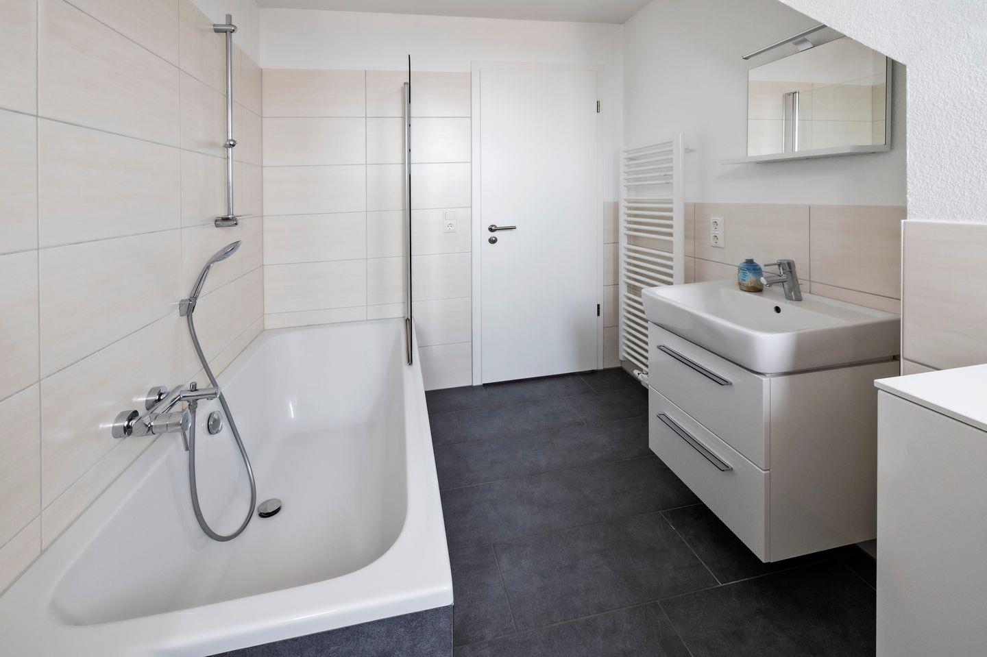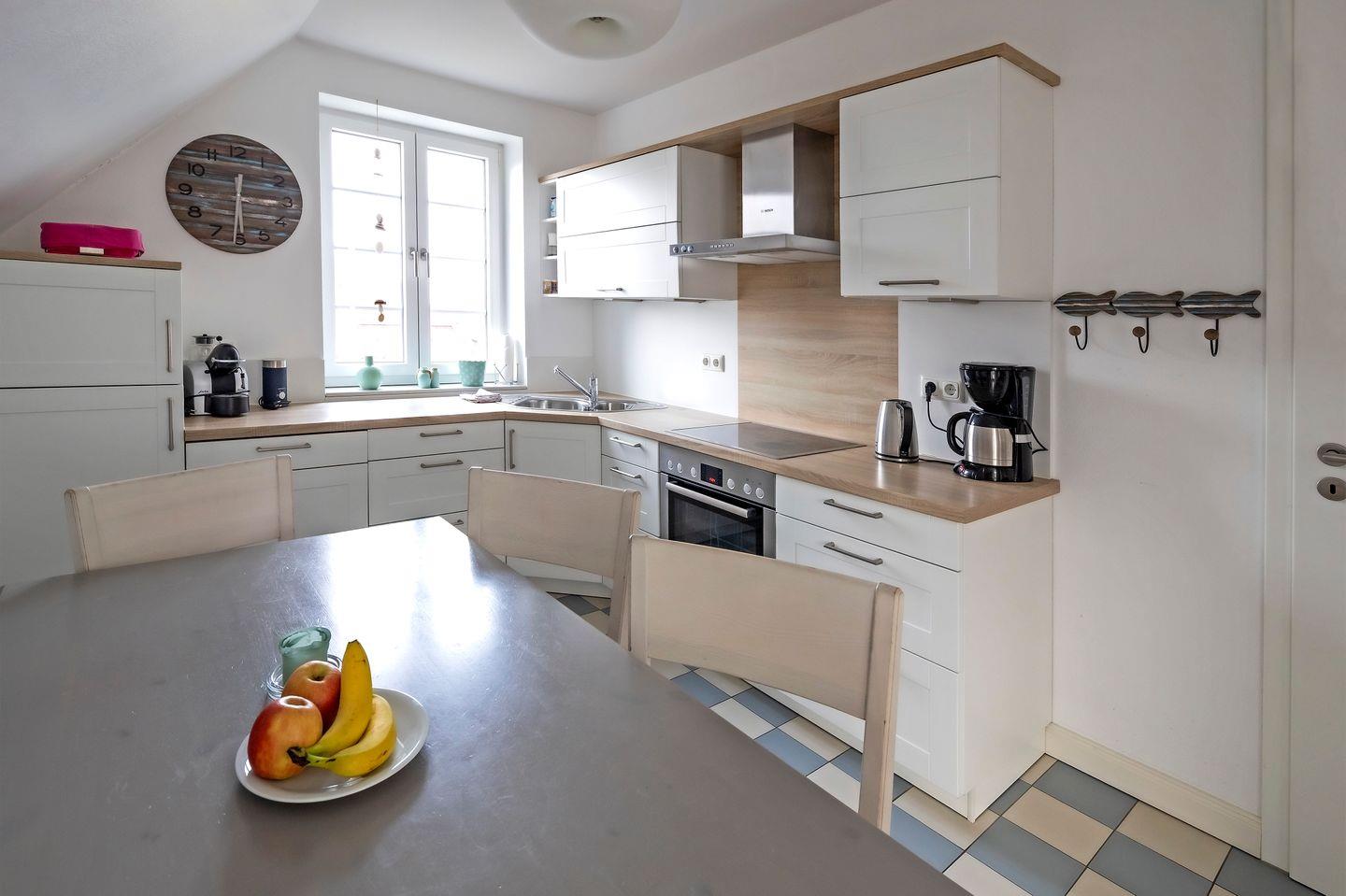 Im unteren Bereich der Wohnung ist der vollausgestattete Küchenbereich mit Essplatz für die ganze Familie. Das angrenzende, gemütliche Wohnzimmer mit Fernseher und vielem MEER lädt zum Verweilen ein. Von Wohnbereich sowie von der Küche aus haben Sie Zugang auf die windgeschützte Loggia mit einladender Sitzgruppe. Des Weiteren befinden sich auf dieser Etage zwei Schlafzimmer mit jeweils einem Doppelbett in den Maßen 180x200 cm sowie ein helles Tageslichtbad. Ihnen stehen eine bodentiefe, großzügige Dusche, ein Waschtisch und ein WC zur Verfügung. Im Dachgeschoss befindet sich ein Appartement, welches mit einer kleinen Pantryküche sowie einem gemütlichem Essplatz ausgestattet ist. Zusätzlich bietet sie einen Wohn- und Schlafbereich für bis zu zwei weiteren Personen. Das Badezimmer verfügt über eine Badewanne.