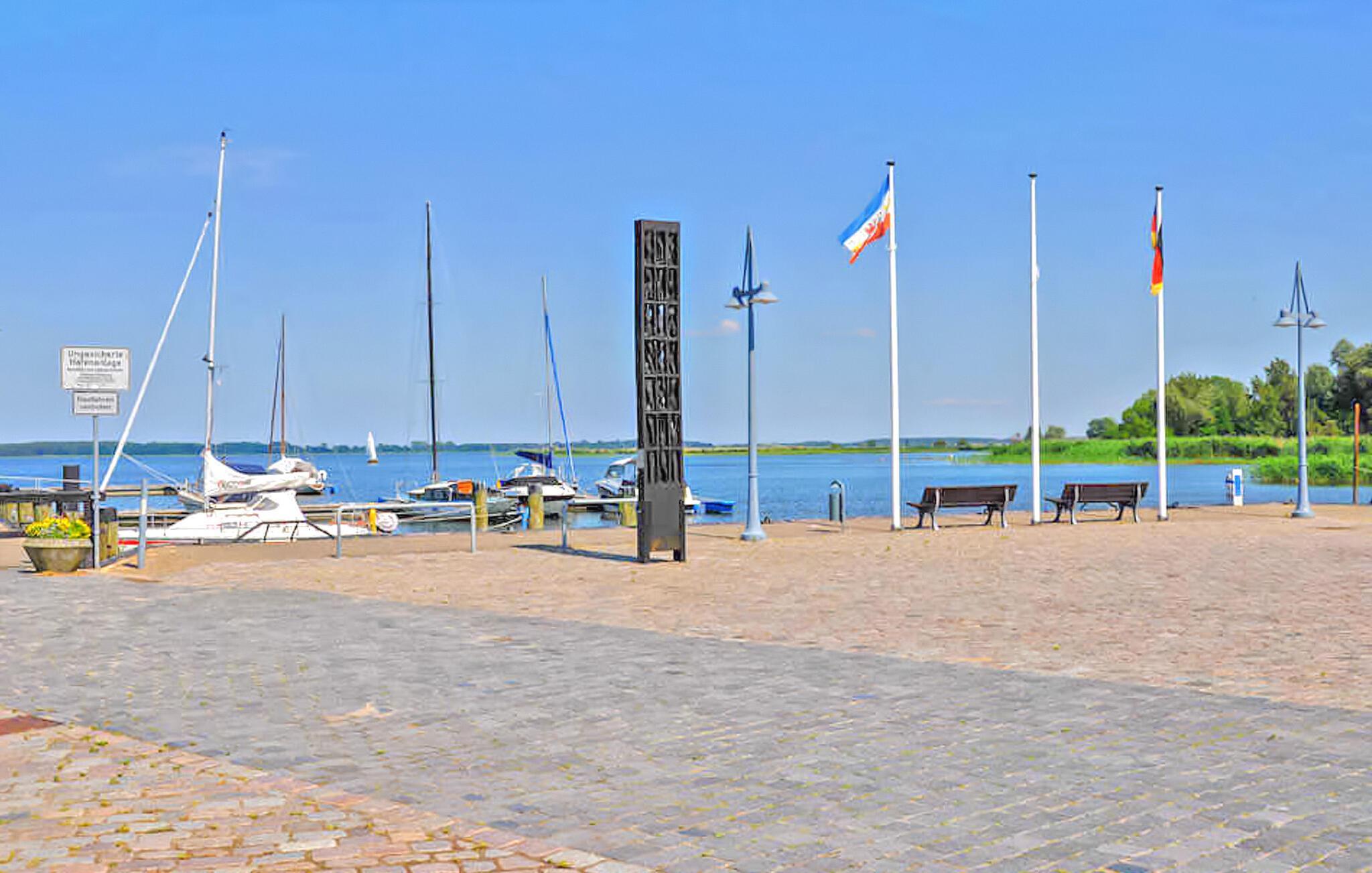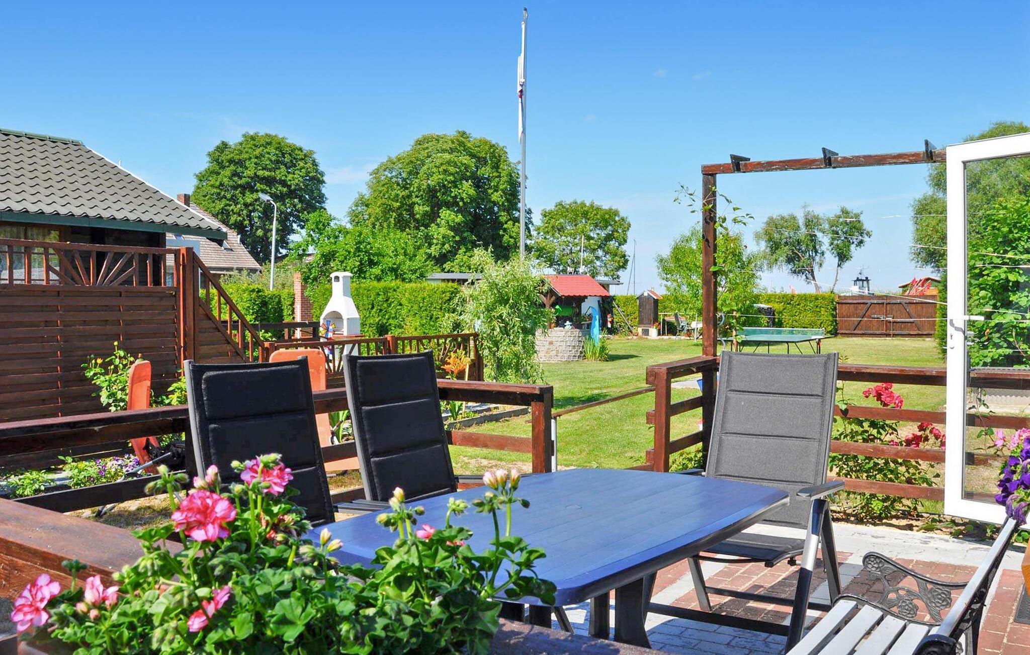 En av to ferieboliger i tømmerhyttestil for 2 personer hver ligger rett ved Peene-elven på eierens ca. 1300 m² store, fullt inngjerdede boligeiendom. Badeplassen og en restaurant ligger bare ca. 300 og 400 m unna, og sentrum med shoppingmuligheter ligger ca. 500 m unna.