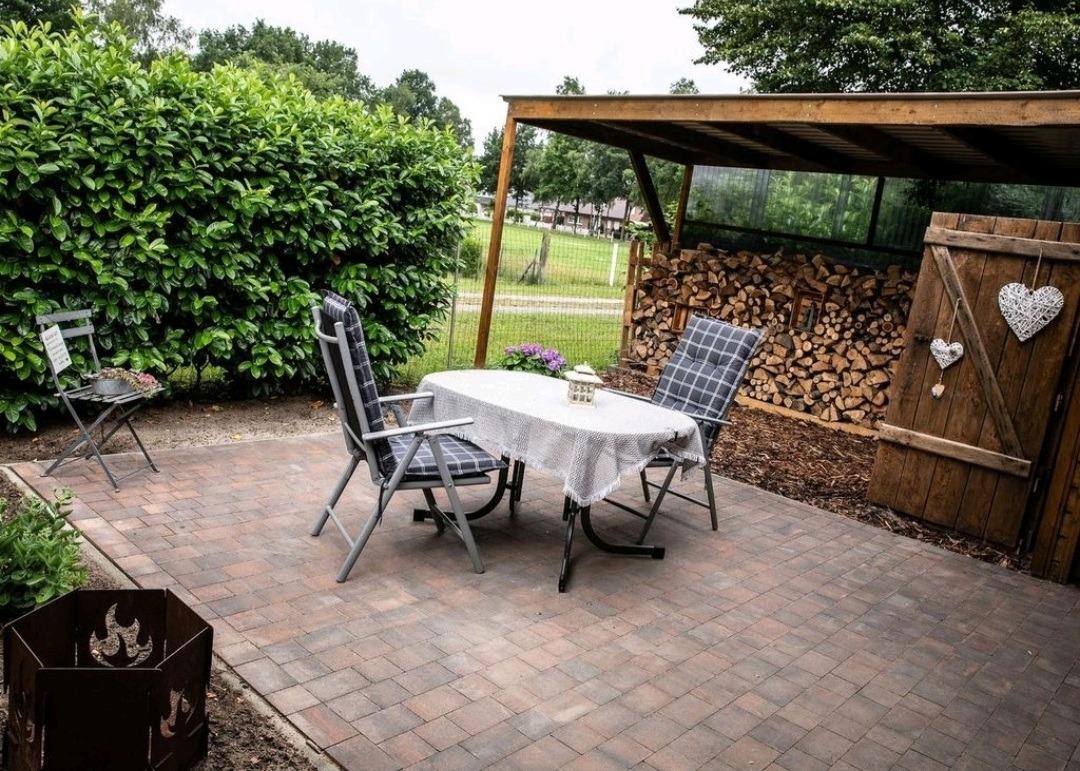 Von der Küche gelangen Sie auf die eingezäunte Terrasse. Dort erwartet Sie eine Sitzgruppe mit Tisch, Grill und Feuerkorb.