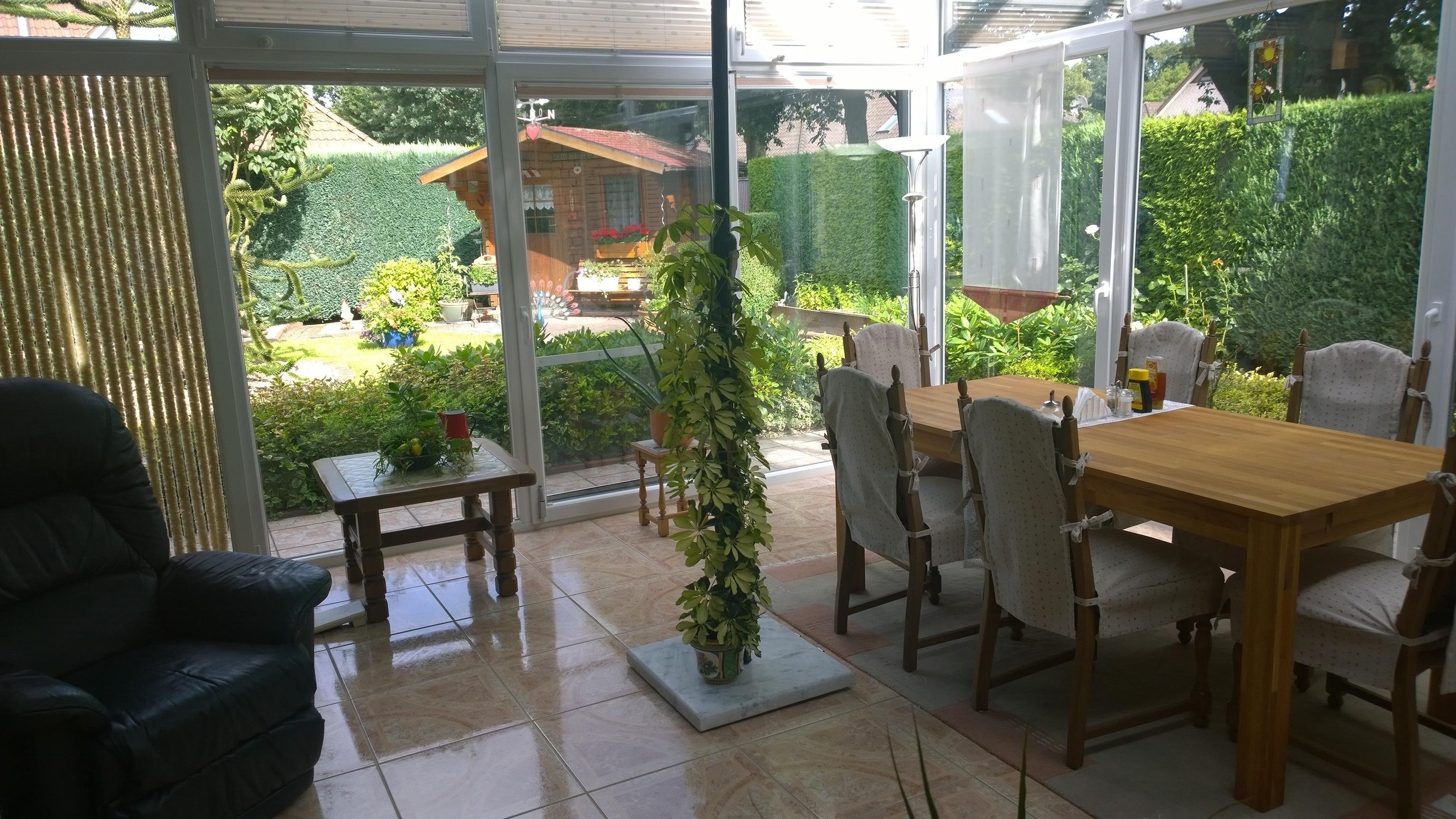 Gepflegte Privatpension in absolut schöner und ruhiger Wohnlage. Großer Wohn-/Schlafraum mit TV, großer Duschraum/ WC evtl. für 2 Zimmer. Frühstücksraum (Wintergarten s.Foto ), reichhaltiges Frühstück, Garagenplatz für Fahrräder inklusive. Eine kleine Küche mit Kühlschrank, Kaffeemaschine, Wasserkocher, Mikrowelle, kl. Backofen (nicht MINI!), sowie Geschirr steht zur Verfügung. Spülservice wird von uns übernommen. Rauchfrei, überdachte Raucherecke, W-LAN, Parkplatz am Haus.