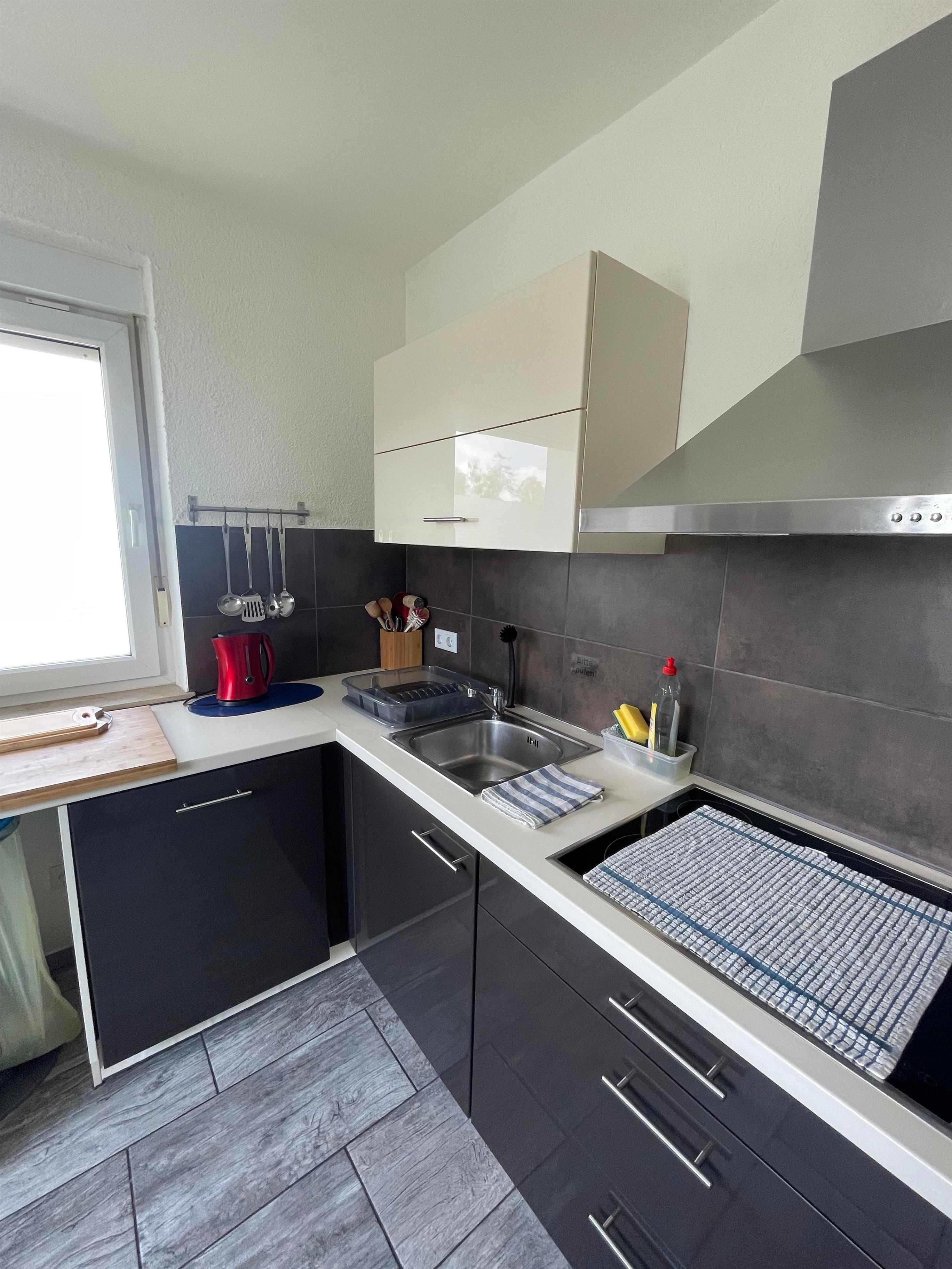 - Voll ausgestattete Küche mit Herd, Kühlschrank, Geschirrspüler, Geschirr, Besteck, Wasserkocher etc.