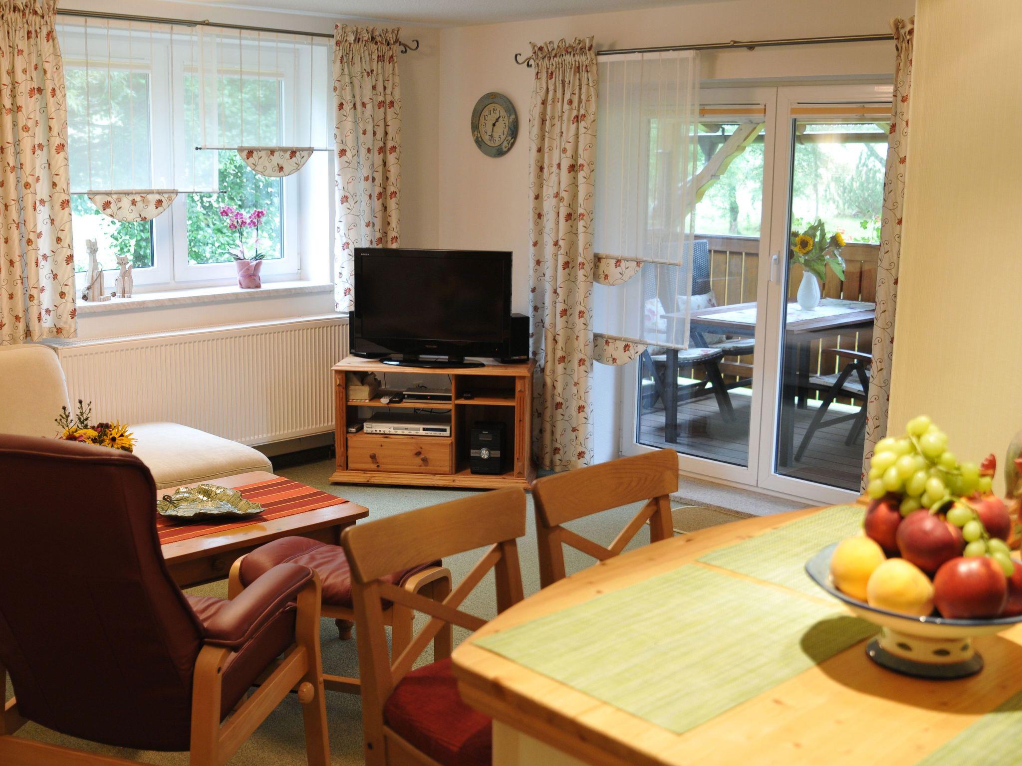 The 120m² holiday flat with separate entrance is spread over two floors. The ground floor consists of the following rooms: a living room with pull-out couch, a modern flat-screen TV with satellite TV, DVD player and stereo system, as well as access to a covered terrace with a view of the farm garden and pond, a bedroom with double bed and storage space for your textiles, an open, fully equipped fitted kitchen with hob, oven, microwave and dishwasher and an adjoining bathroom with shower and WC. In the basement there is another fully furnished bedroom with a double bed, a bathroom with WC and a separate shower. A well-stocked library and a sauna with relaxation room await you in bad weather.
