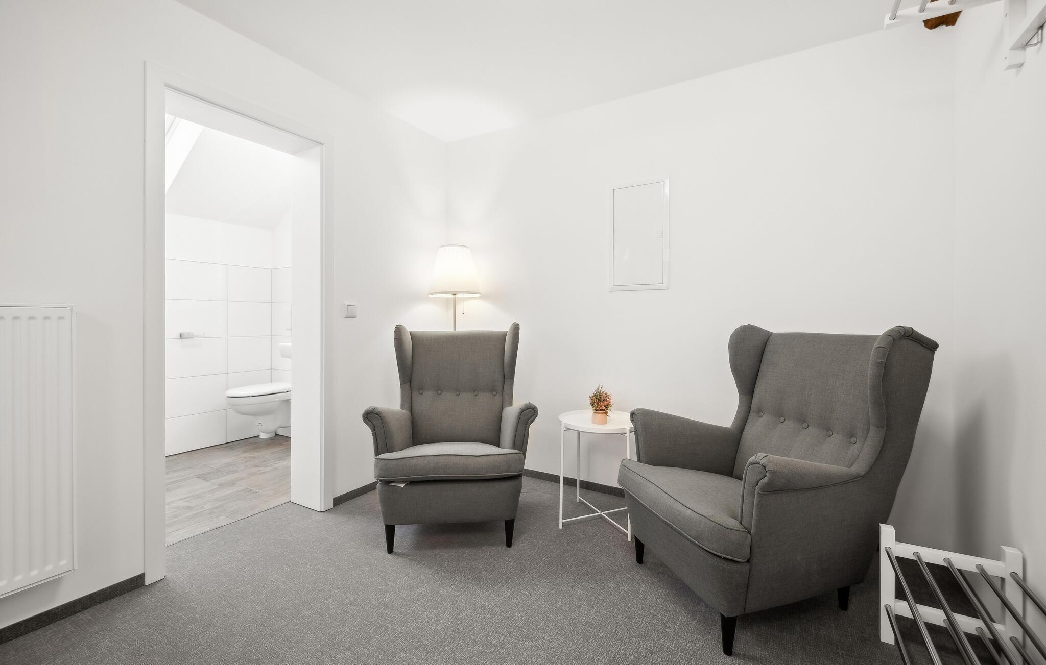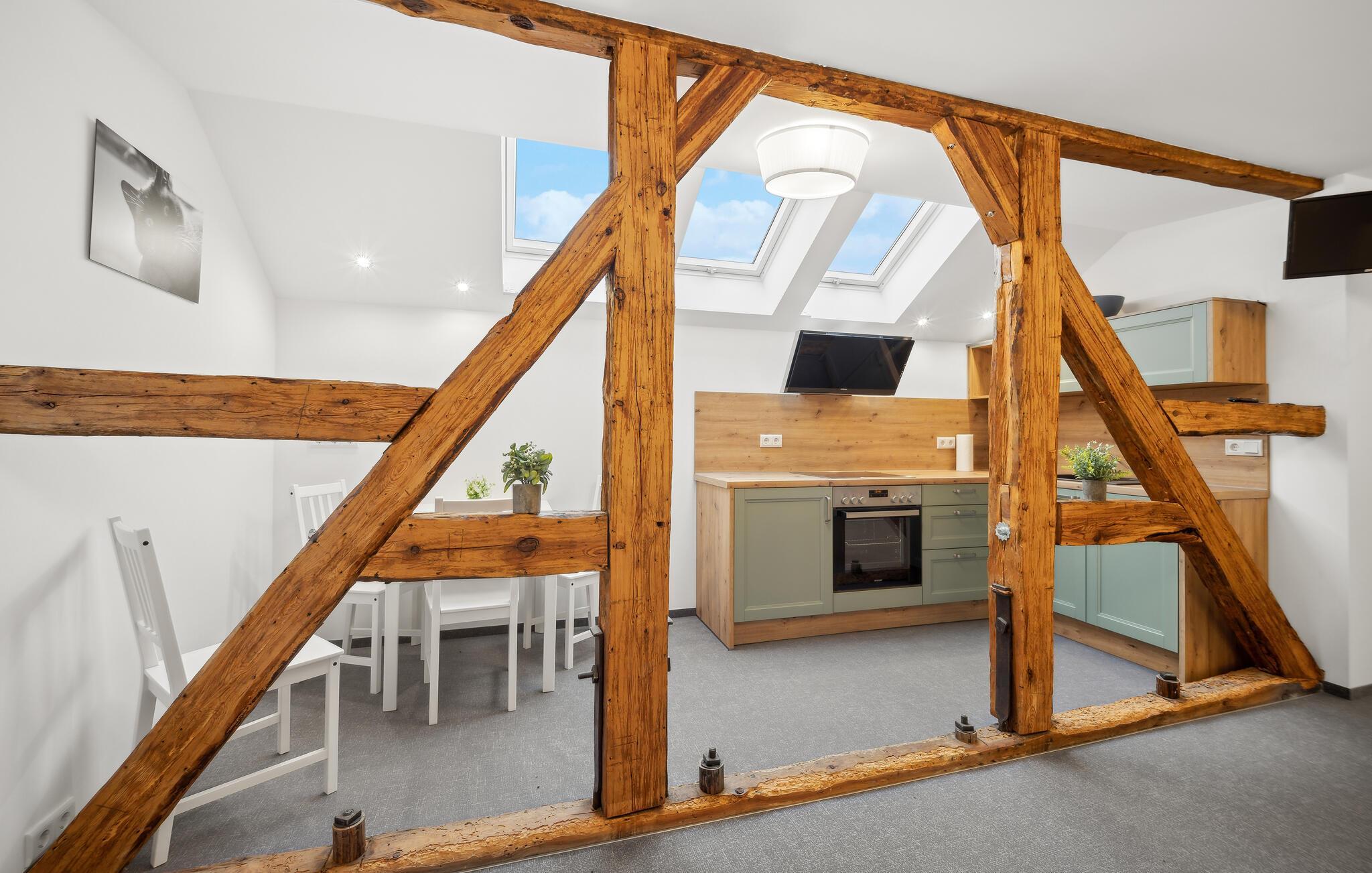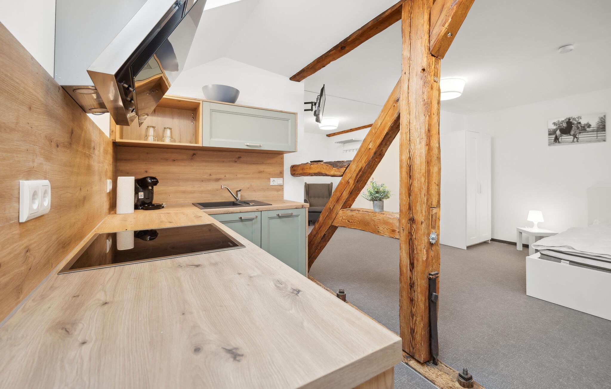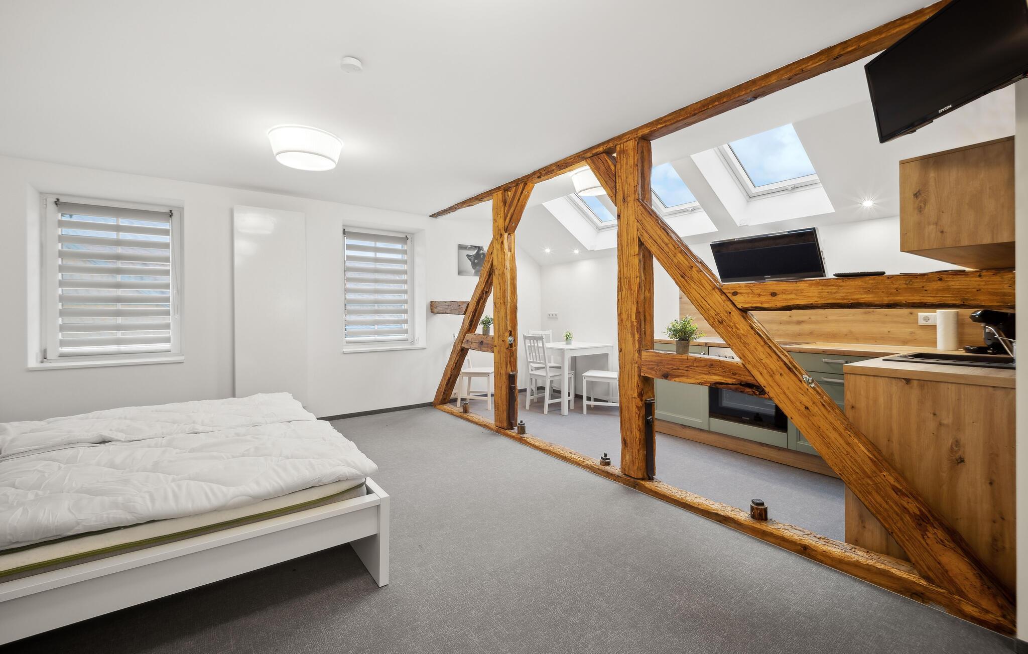 Nyt ferien i denne stilfulle ettromsleiligheten i Großräschen. Kombinasjonen av eksponert bindingsverk og moderne møbler skaper en koselig atmosfære som er ideell for avslappende dager som par eller alene. Hvis du reiser sammen med et vennepar, finnes det andre ferieleiligheter i huset, avhengig av tilgjengelighet. Den åpne stue- og spisestuen innbyr til felles matlaging og avslapning, mens det store vinduet slipper inn rikelig med lys. Her kan dere koble av etter aktive dager i naturen.