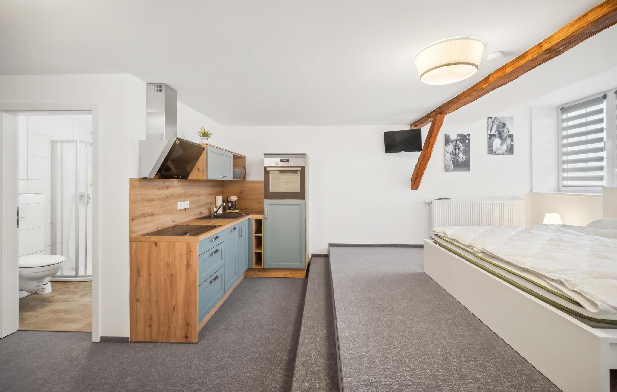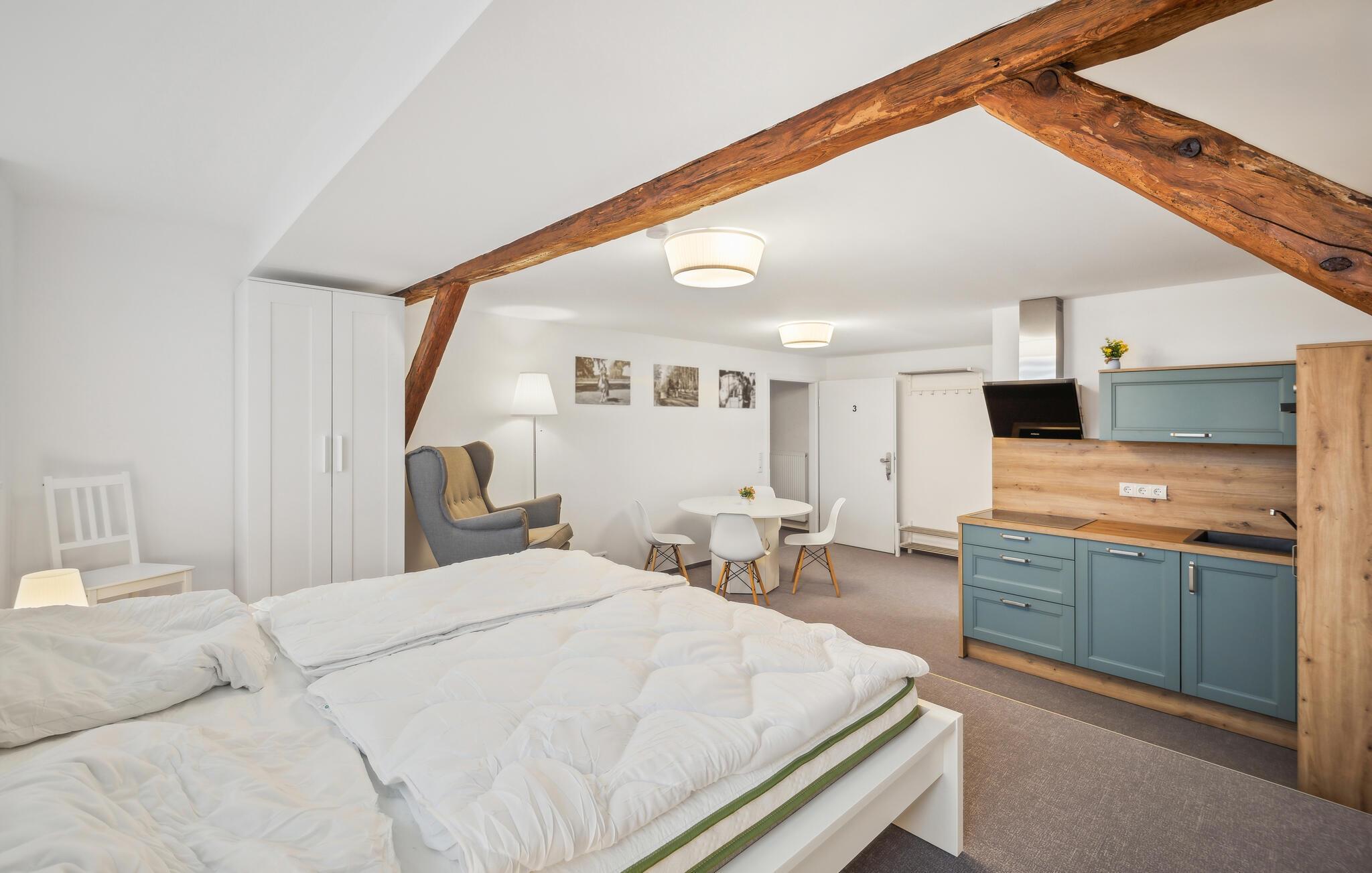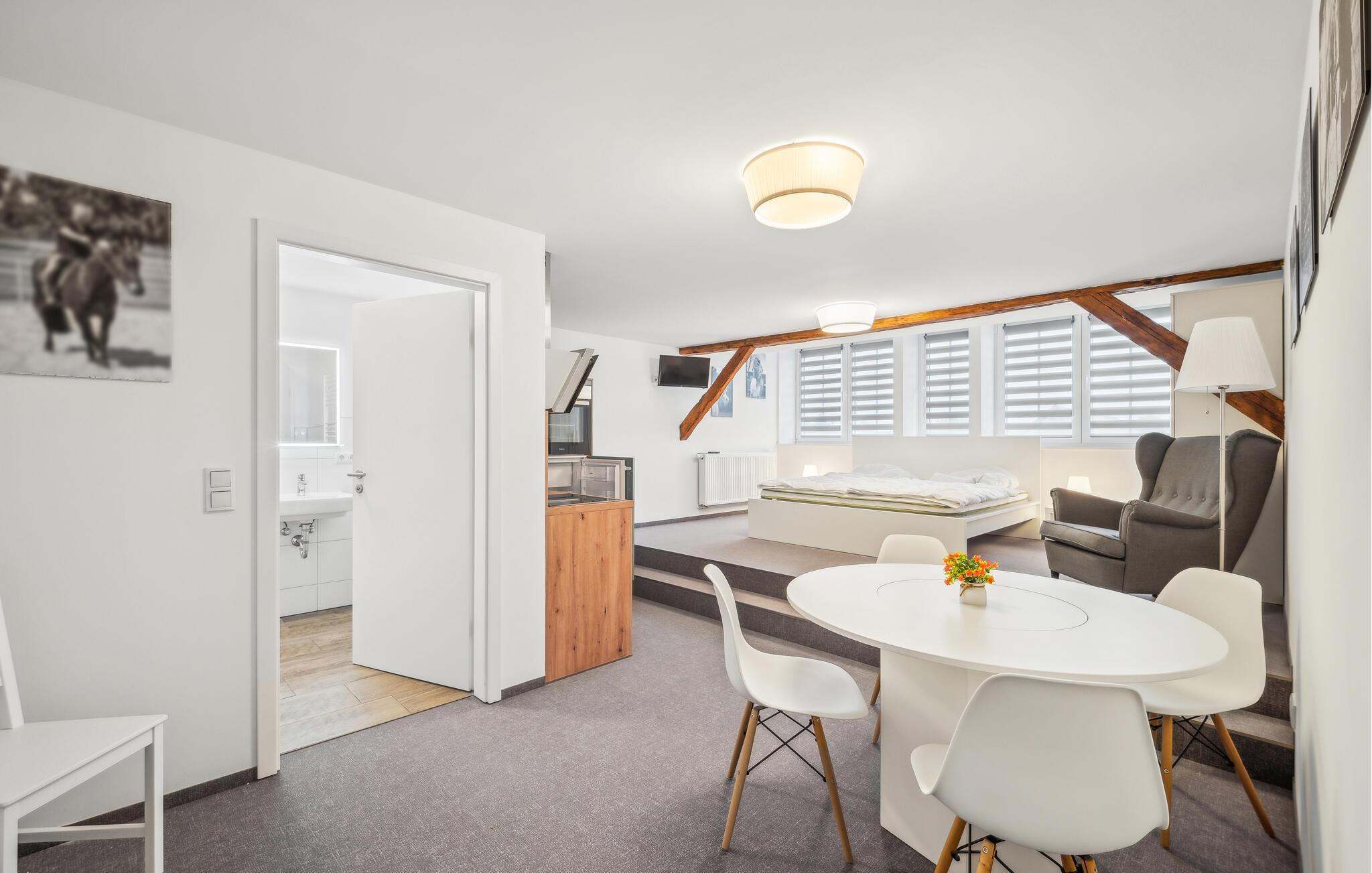 Nyt ferien i denne stilfulle ettromsleiligheten i Großräschen. Kombinasjonen av eksponert bindingsverk og moderne møbler skaper en koselig atmosfære som er ideell for avslappende dager som par eller alene. Hvis du reiser sammen med et vennepar, finnes det andre ferieleiligheter i huset, avhengig av tilgjengelighet. Den åpne stue- og spisestuen innbyr til felles matlaging og avslapning, mens det store vinduet slipper inn rikelig med lys. Her kan dere koble av etter aktive dager i naturen.
