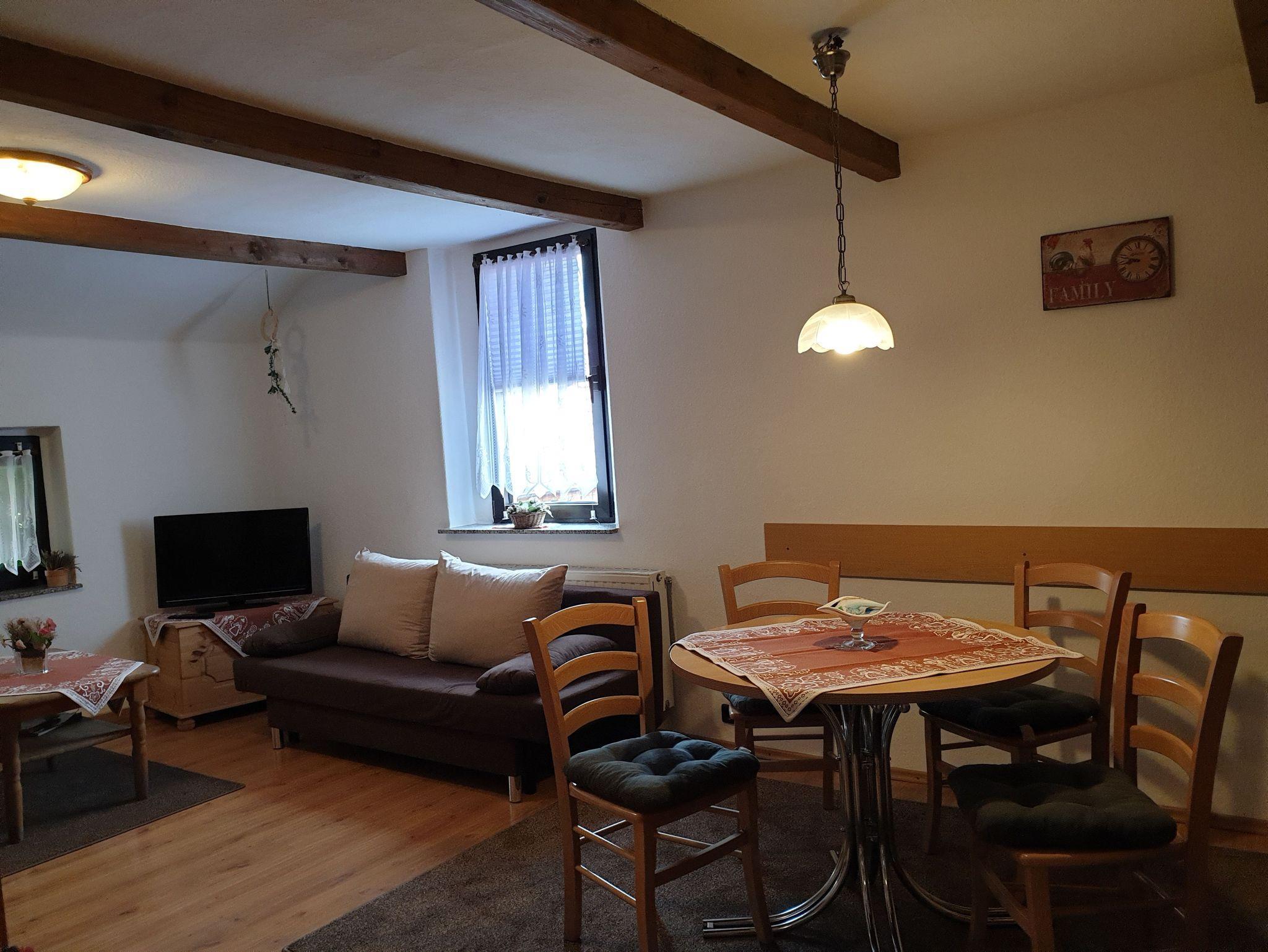 Die Ferienwohnung ist ausgestattet mit 1 Schlafraum, Wohnraum mit TV, Küche und DU/WC.