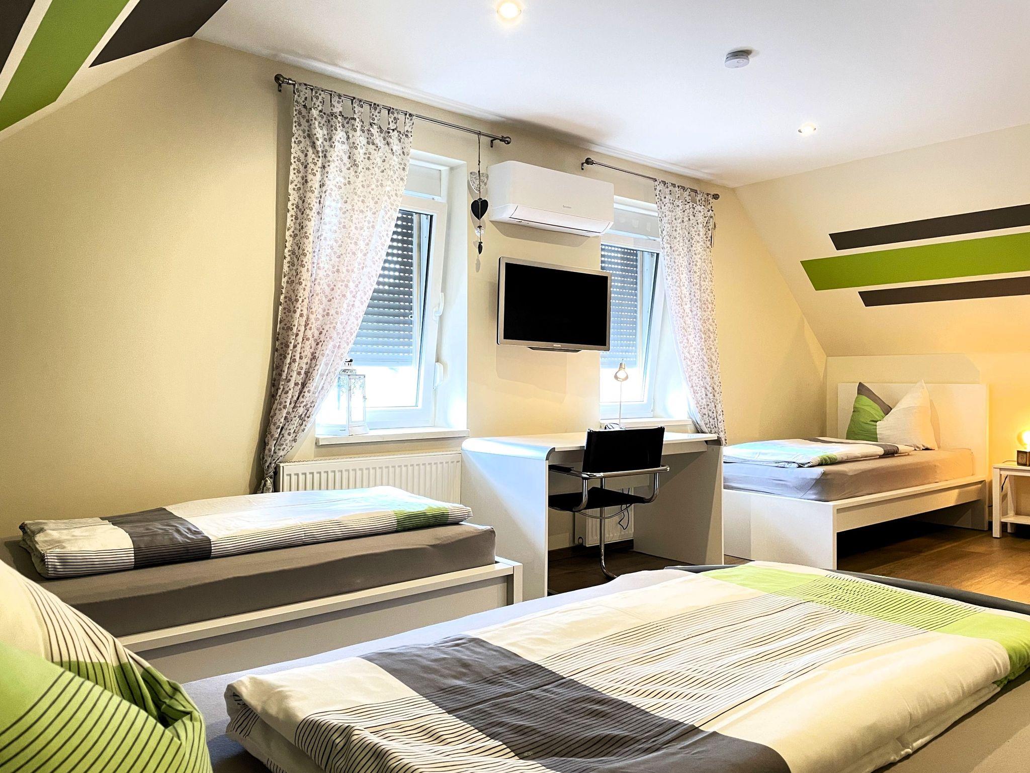Das Zimmer bietet Platz für bis zu vier Personen und ist mit zwei Einzelbetten sowie einem Doppelbett (1,40 m breit) ausgestattet. Auf Wunsch steht zusätzlich ein Babybett für Kinder bis 3 Jahre bereit. Ein gemütliches Sofa mit Couchtisch lädt zum Entspannen ein, während der Smart-TV für angenehme Unterhaltung sorgt.