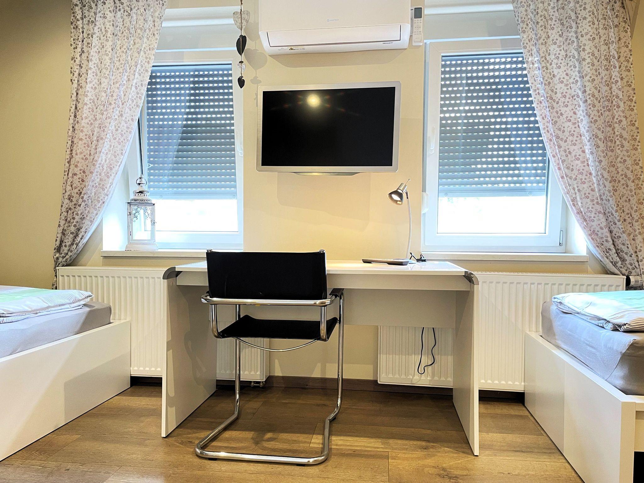 Ein Schreibtisch bietet Platz für kleine Schreibarbeiten oder den Laptop, und die Klimaanlage sorgt auch an warmen Tagen für ein angenehmes Raumklima.