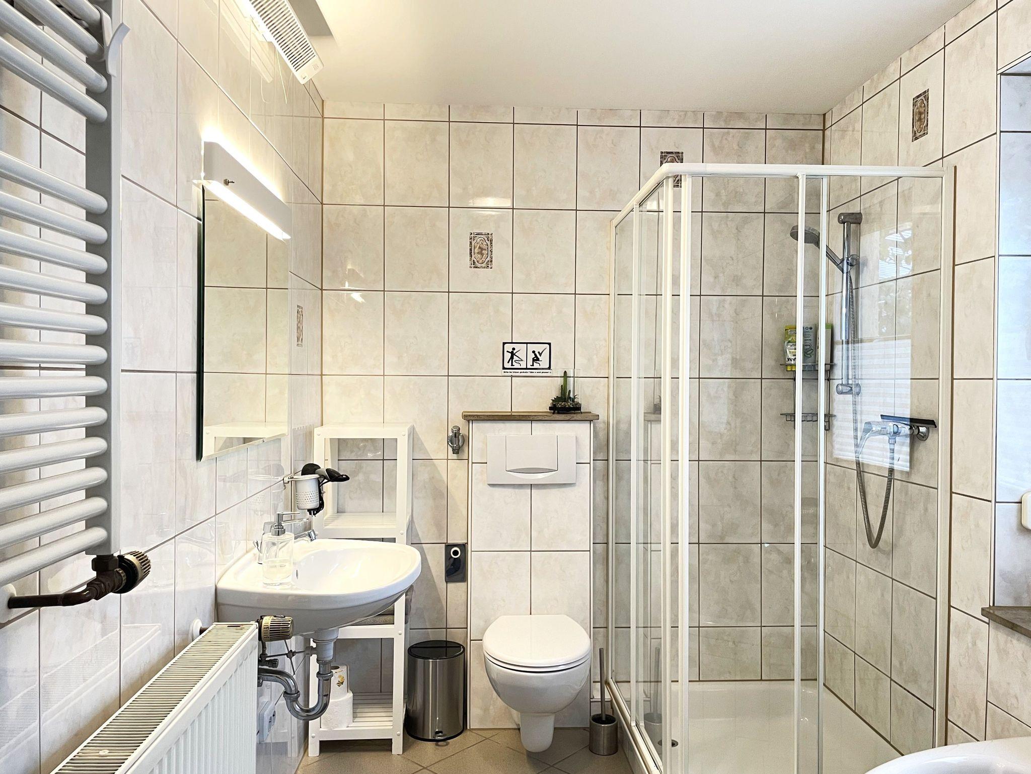 Das moderne Bad ist mit einer Dusche, einem Waschbecken, WC und einem Handtuchwärmer ausgestattet. Ein kleiner Flur mit Garderobenschrank bietet zusätzlichen Stauraum und rundet das wohnliche Gesamtbild ab.