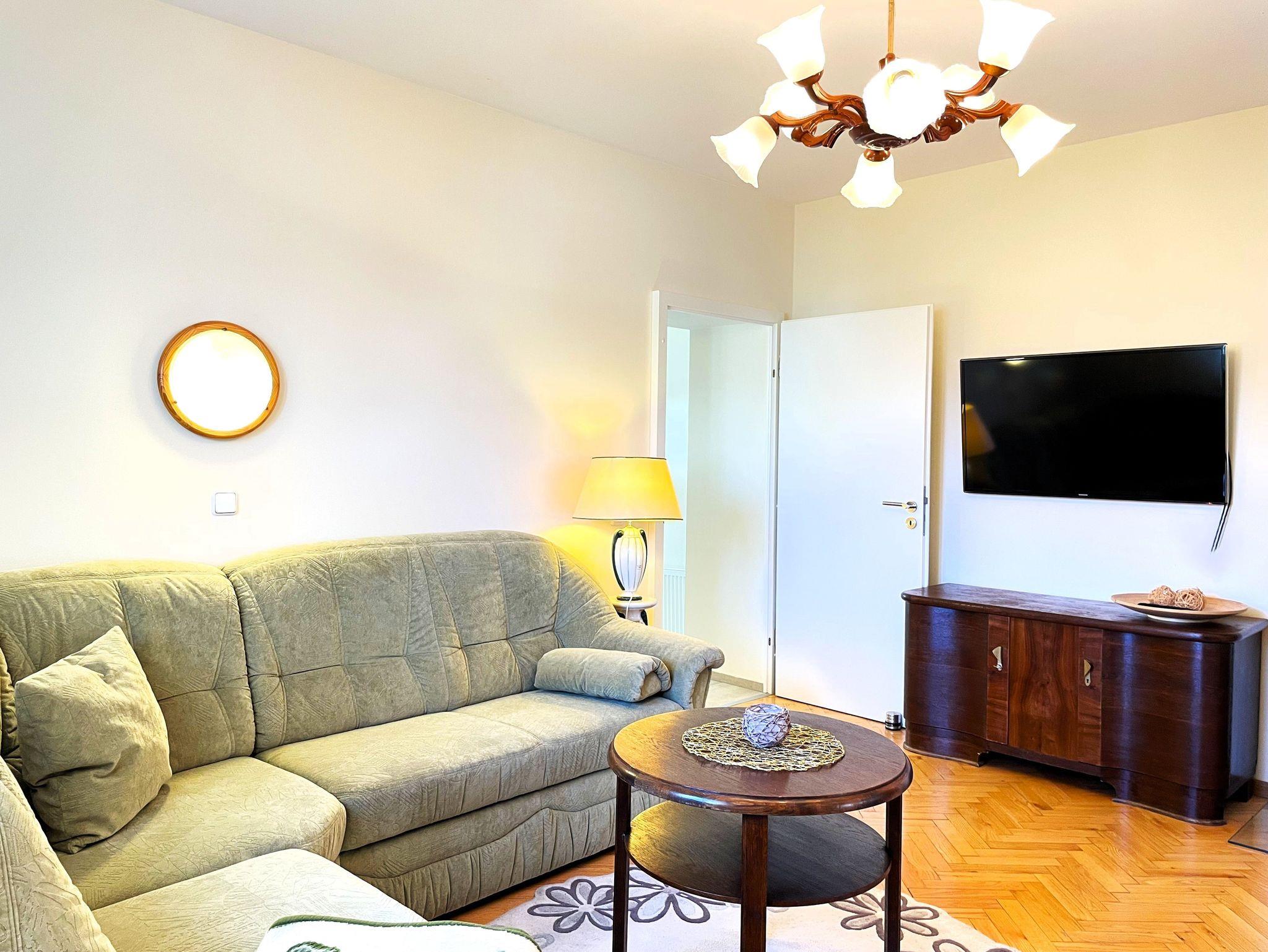 Der Wohnbereich ist behaglich eingerichtet und lädt mit seinem komfortablen Ecksofa zum Entspannen ein dieses kann bei Bedarf als zusätzliche Schlafmöglichkeit genutzt werden. Ein Smart-TV sorgt für Unterhaltung und gemütliche Abende.