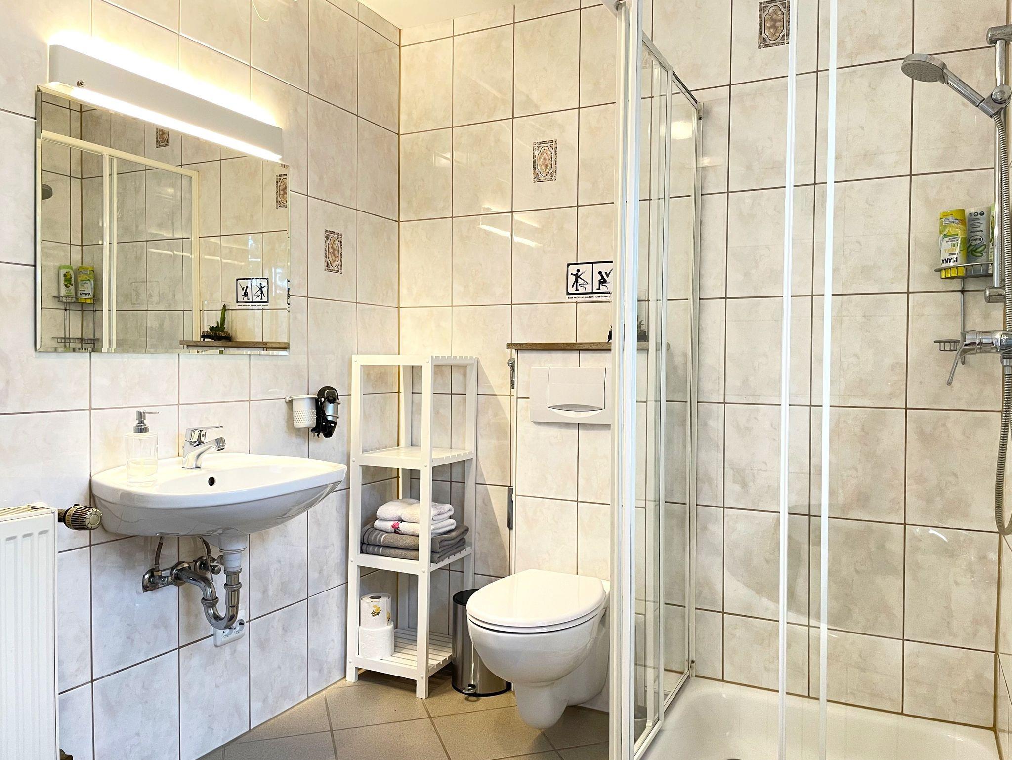 Ankommen, wohlfühlen, entspannen: Unsere Unterkunft bietet auf zwei Etagen drei liebevoll eingerichtete Gästezimmer, jedes mit eigenem Bad für Ihre Privatsphäre. Im Erdgeschoss befindet sich eine Gemeinschaftsküche, die Raum für Begegnungen bietet und sich ideal zum Kochen oder für einen Plausch mit anderen Gästen eignet. Zwei Kühlschränke in der Unterkunft sorgen dafür, dass alle ausreichend Platz für ihre Vorräte haben. Zusätzlich steht Ihnen hier auch eine Waschmaschine zur Verfügung praktisch für längere Aufenthalte.