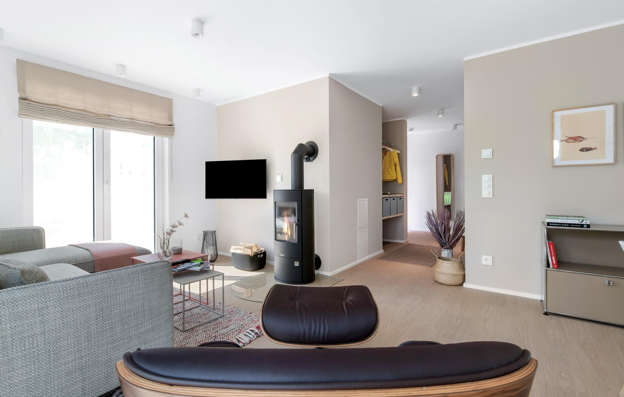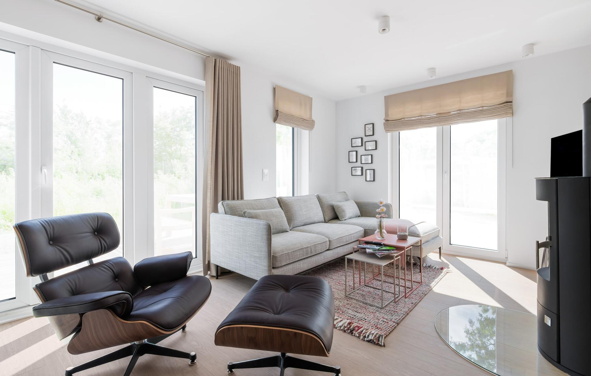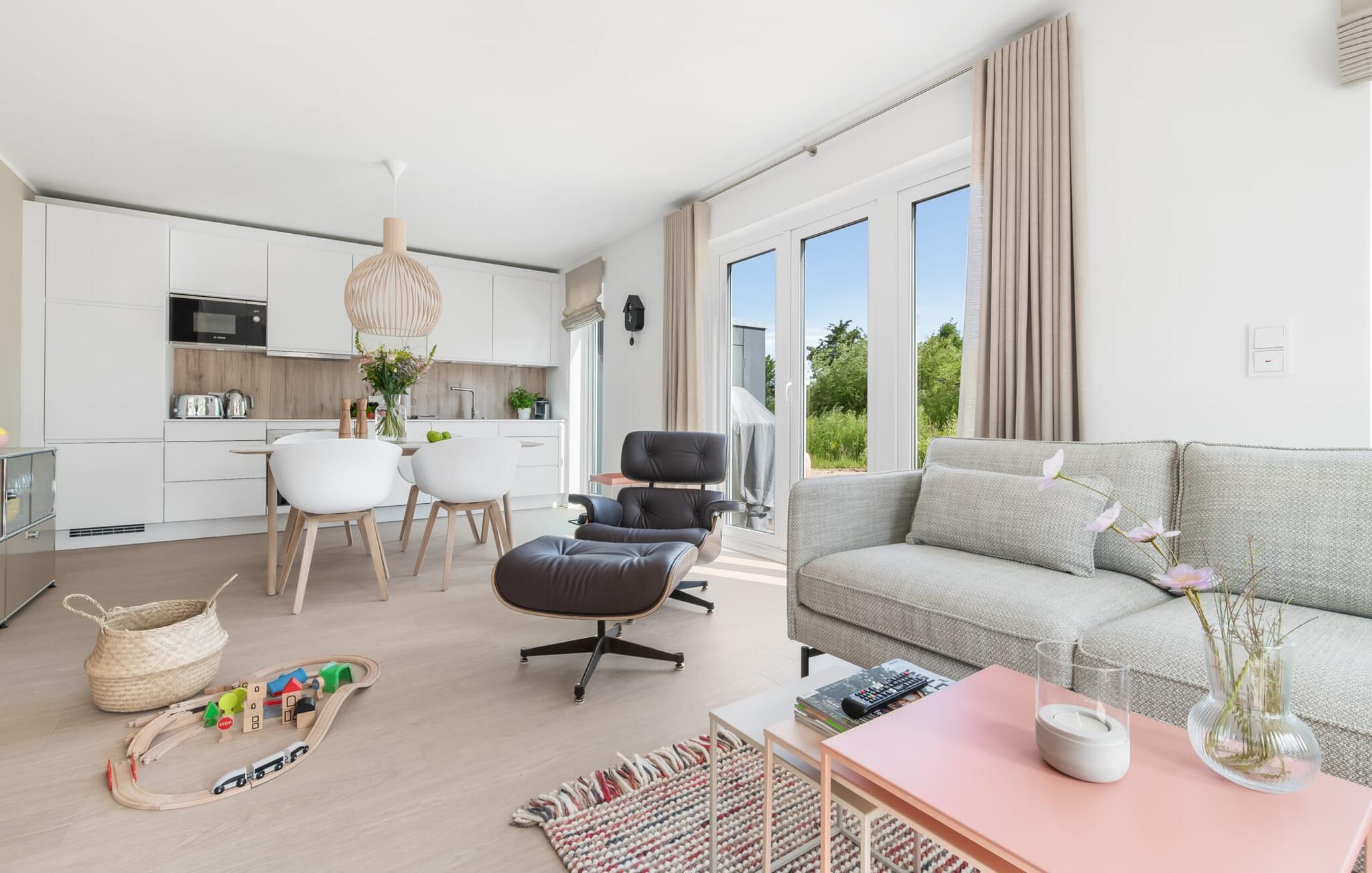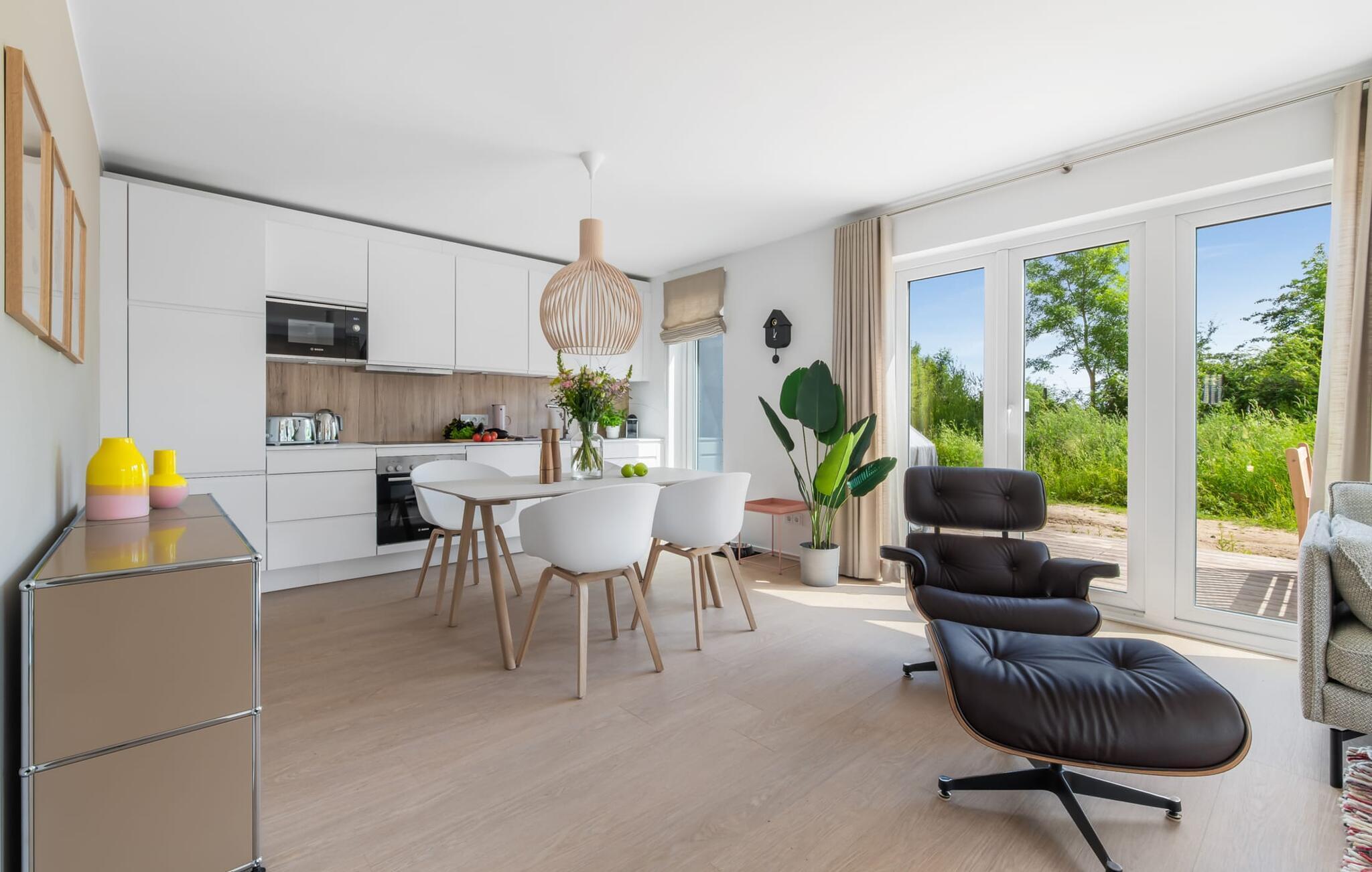 Vinduene fra gulv til tak og den tilstøtende romslige sørvestvendte terrassen er leilighetens hjerte sammen med den åpne stue-/spisestuen. Å komme inn her og umiddelbart føle seg hjemme er én ting. Å slappe av i den koselige sofaen, nyte stillheten i naturen fra vinduet eller se på TV er ren avslapning og rekreasjon. Og når Østersjøen viser seg fra sin solskinnsside, innbyr LAZY DAYS terrasse med sin komfortable strandstol til å nyte den hele dagen lang. I det nordiske været sørger vedovnen med sin knitrende ild for ekstra hygge.