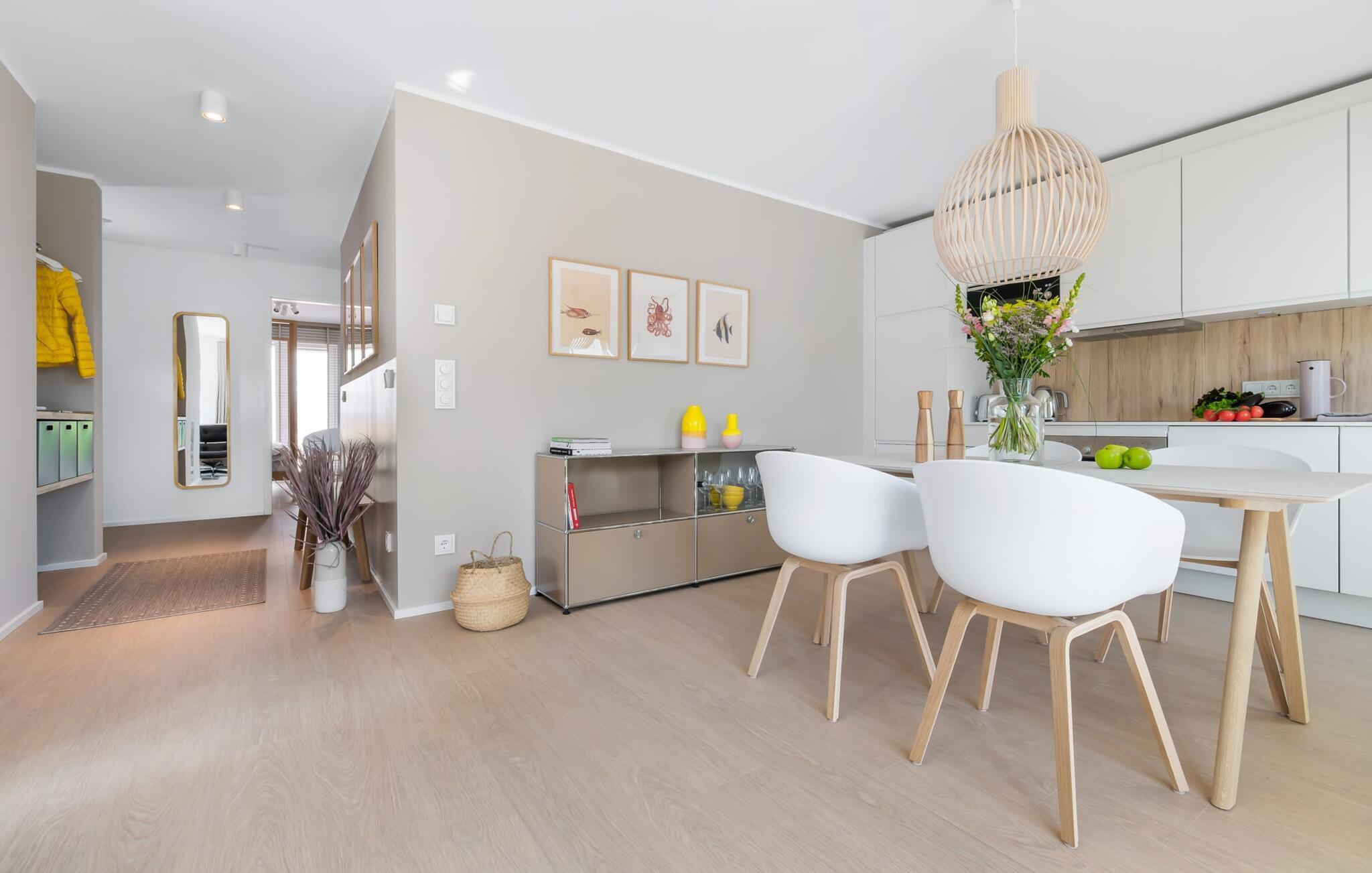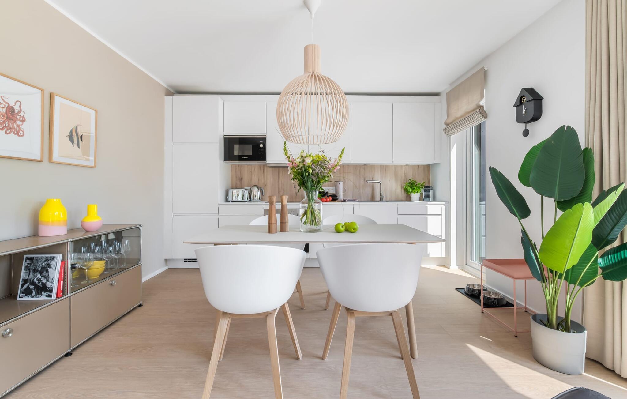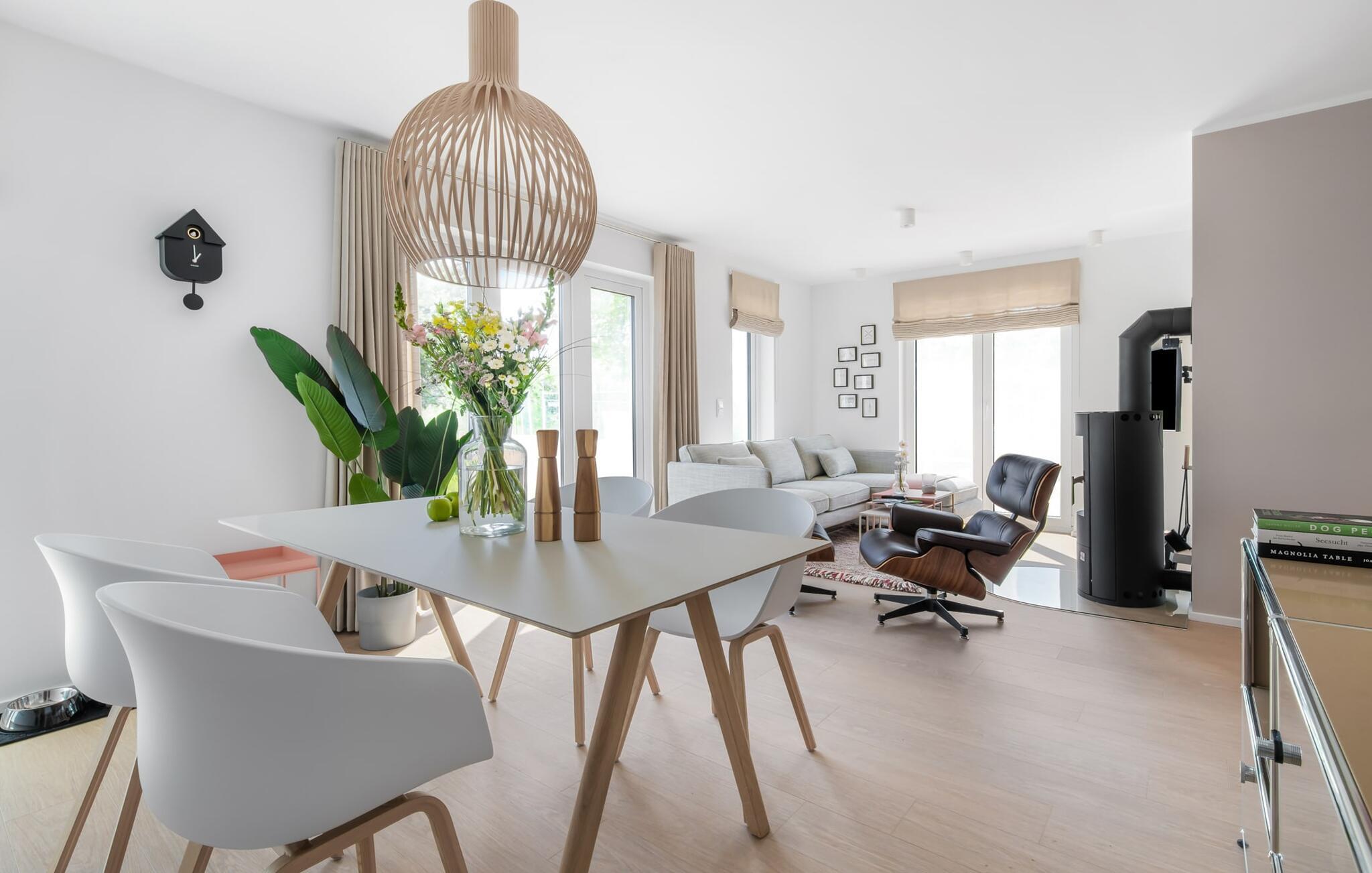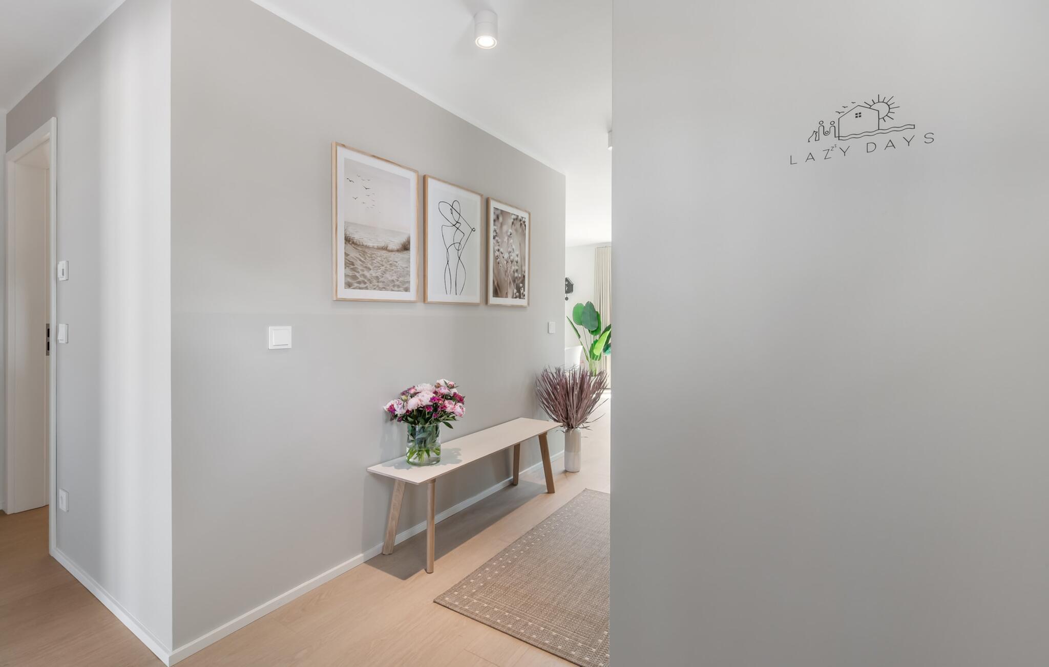 Vinduene fra gulv til tak og den tilstøtende romslige sørvestvendte terrassen er leilighetens hjerte sammen med den åpne stue-/spisestuen. Å komme inn her og umiddelbart føle seg hjemme er én ting. Å slappe av i den koselige sofaen, nyte stillheten i naturen fra vinduet eller se på TV er ren avslapning og rekreasjon. Og når Østersjøen viser seg fra sin solskinnsside, innbyr LAZY DAYS terrasse med sin komfortable strandstol til å nyte den hele dagen lang. I det nordiske været sørger vedovnen med sin knitrende ild for ekstra hygge.
