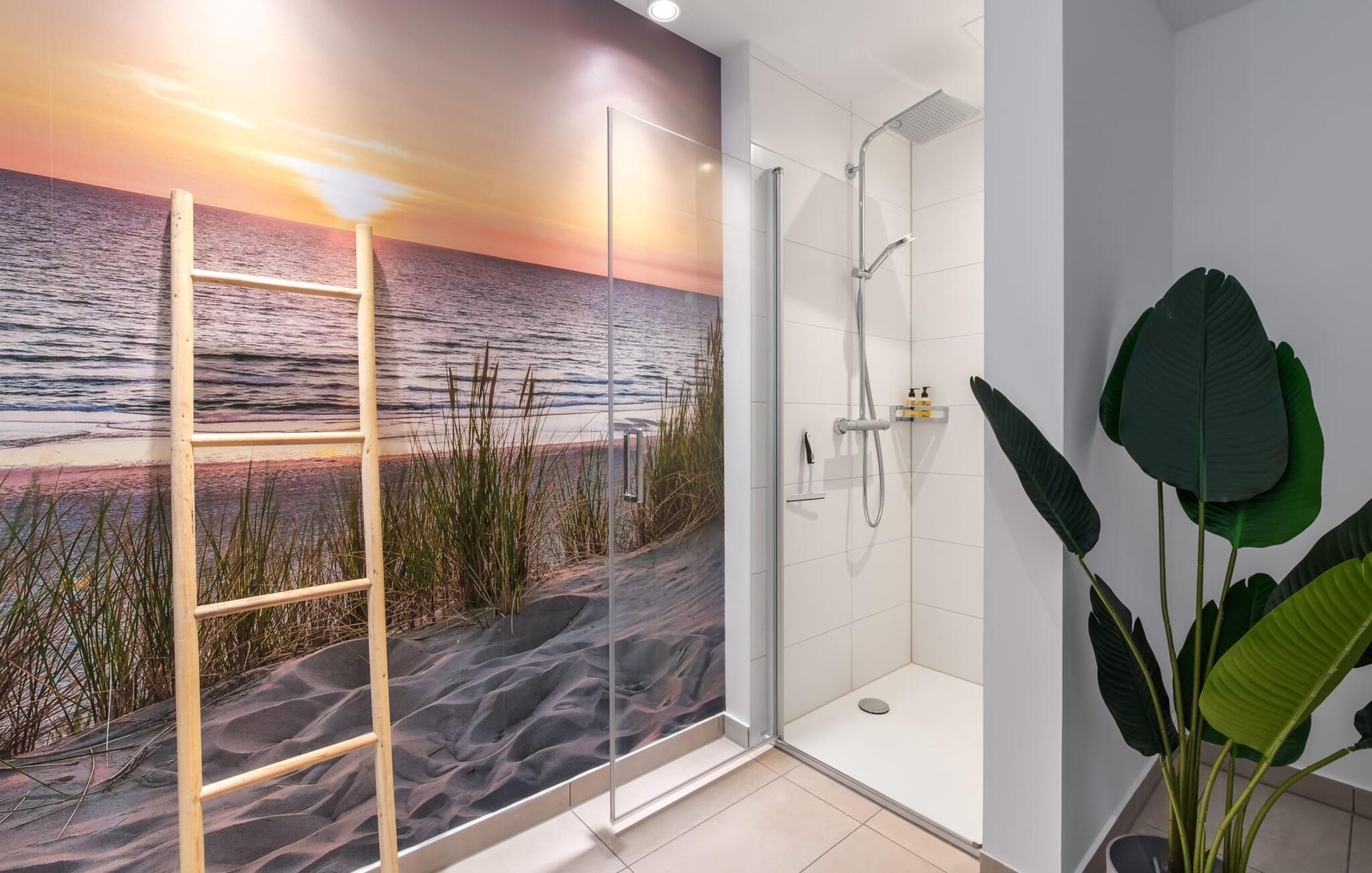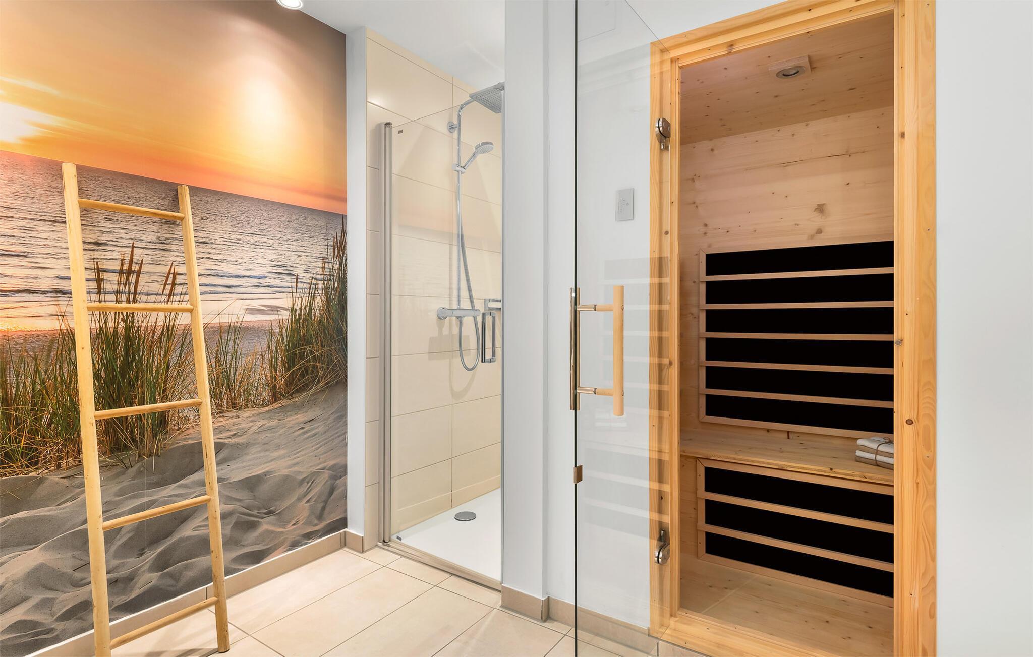 Dusjrommet med dusjkabinett og badstue sørger for uforglemmelige velværeøyeblikk
