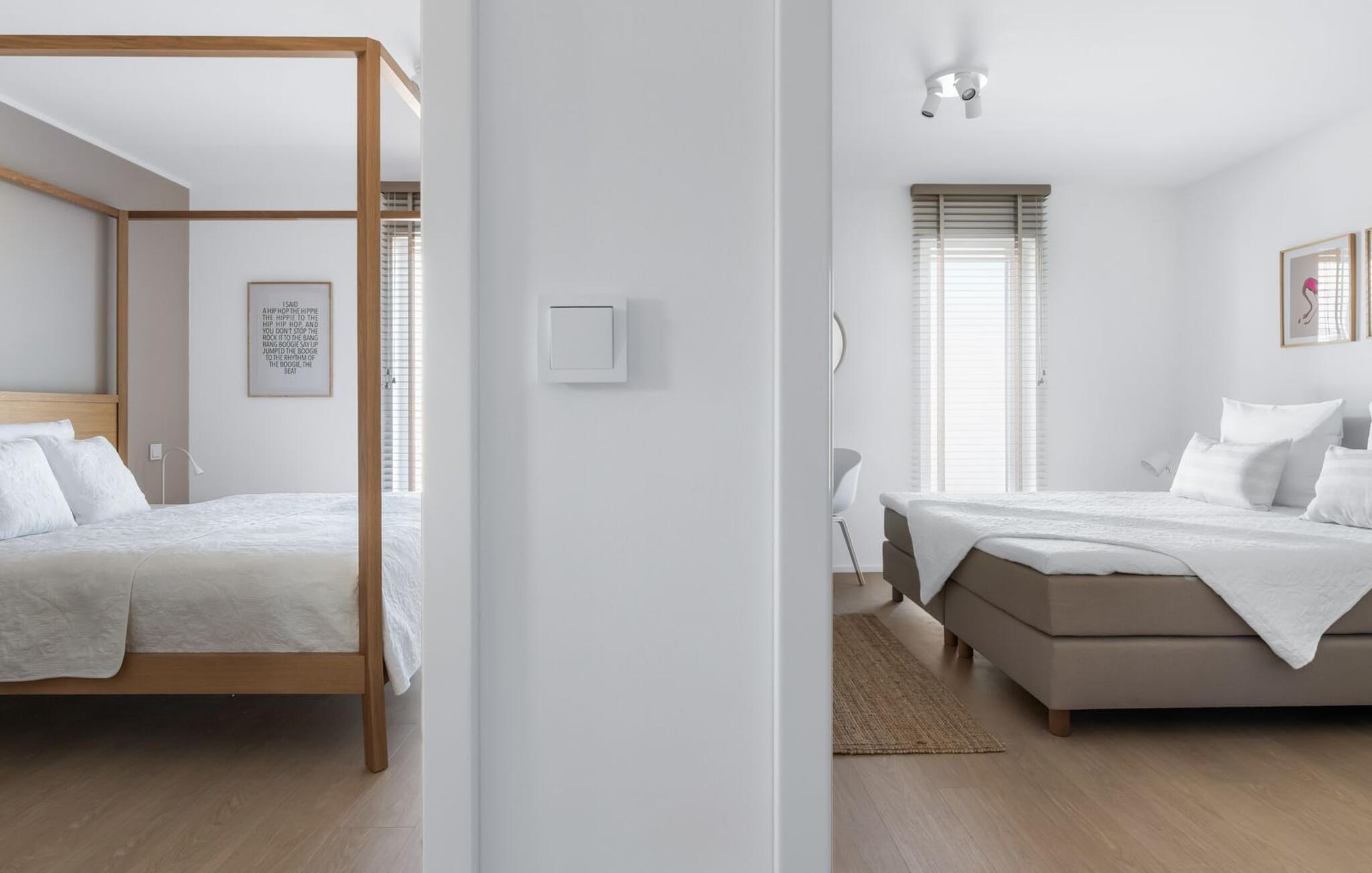 2 soverom er tilgjengelig for en god natts søvn. I det første soverommet finner du en vakker himmelseng, mens det andre soverommet med to komfortable enkeltsenger med fjærfjærer inviterer deg til å drømme. Begge soverommene er utstyrt med en ekstra TV.