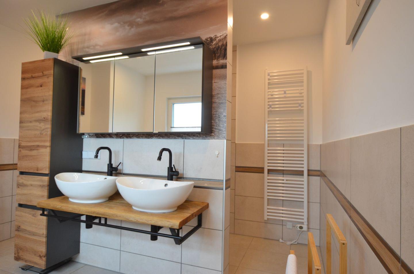 Im Badezimmer im Obergeschoss erwartet Sie eine Badewanne , eine ebenerdiger Dusche, ein Doppelwaschbecken, ein WC und einen Waschtrockner. sowie einen Wäscheständer.