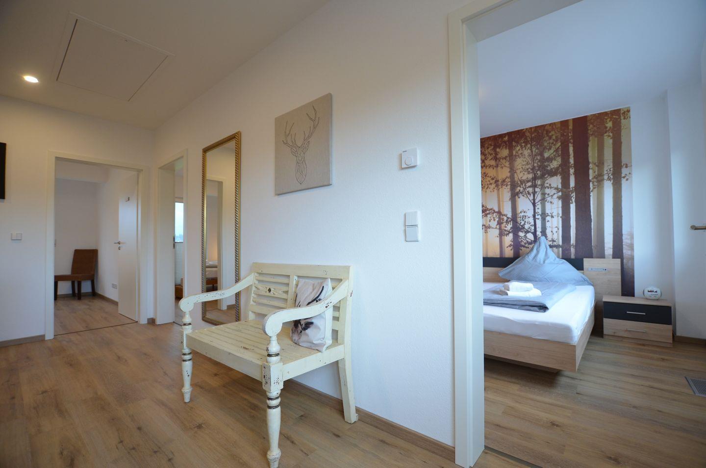 Über die Treppe erreichen Sie die vier Schlafzimmer, jeweils mit Doppelbett, Kleiderschrank und Fernseher.