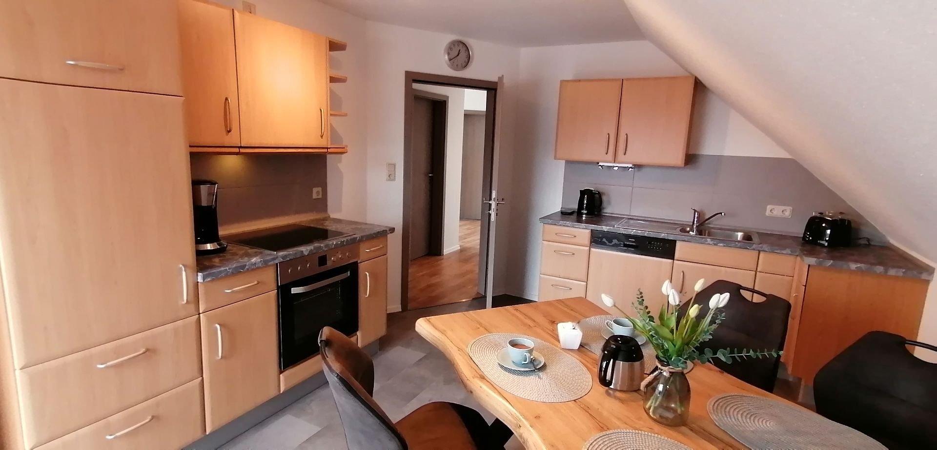 Willkommen in der Ferienwohnung Lütje Moew, gelegen in Leezdorf in Ostfriesland an der Nordseeküste. Unser charmantes Feriendomizil bietet auf 80 Quadratmetern im 1. OG Platz für bis zu vier Gäste. Mit zwei Schlafzimmern, einer Küche, einem Badezimmer und Dachterrasse ist es der perfekte Ort für einen entspannten Urlaub.Die Wohnung besticht durch ihre gemütliche Ausstattung mit Venylboden und komfortablen Möbeln. Das Wohnzimmer lädt mit seinen bequemen Sofas und dem Fernseher zum Entspannen ein. Die Küche ist mit einer Tür schließbar und mit Spülmaschine, Mikrowelle, Wasserkocher, Kaffeemaschine und Backutensilien ausgestattet und bietet alles, was Sie für die Zubereitung von leckeren Mahlzeiten benötigen. Genießen Sie Ihr Frühstück oder einen gemütlichen Abend auf der Dachterrasse mit Blick auf den wunderschönen Garten oder in die Natur. Zwei Parkplätze steht Ihnen auf der Auffahrt zur Verfügung.Ein Schlafzimmer ist mit einem komfortablen Boxspringbett (180x200), Kleiderschrank und Kommode ausgestattet.In dem zweiten Schlafzimmer befindet sich ebenfalls ein Boxspringbett (140x200), einem Schlafsofa (90x180). Das Badezimmer verfügt über eine Dusche, WC, Waschbecken und ist mit einem Haartrockner ausgestattet. Ein Babybett und ein Hochstuhl stehen für unsere kleinen Gäste bereit. Die Wohnung ist für Langzeitmieten geeignet und bietet einen Allergiker freundlichen Wohnraum. Bitte beachten Sie, dass es sich um eine Nichtraucherwohnung handelt. Ein Bügeleisen- und Brett, sowie WLAN sind ebenfalls vorhanden. Die Ferienwohnung Lütje Moew ist ideal für einen Familien oder Romantikurlaub. Aber auch für Handwerker, die eine Unterkunft in der Region suchen. Entdecken Sie die Schönheit Ostfrieslands und genießen Sie die Ruhe und den Komfort unserer Ferienwohnung. Wir freuen uns auf Ihren Besuch!Die Betten sind bei Anreise bezogen und pro Person liegt ein Handtuchpaket für Sie bereit.