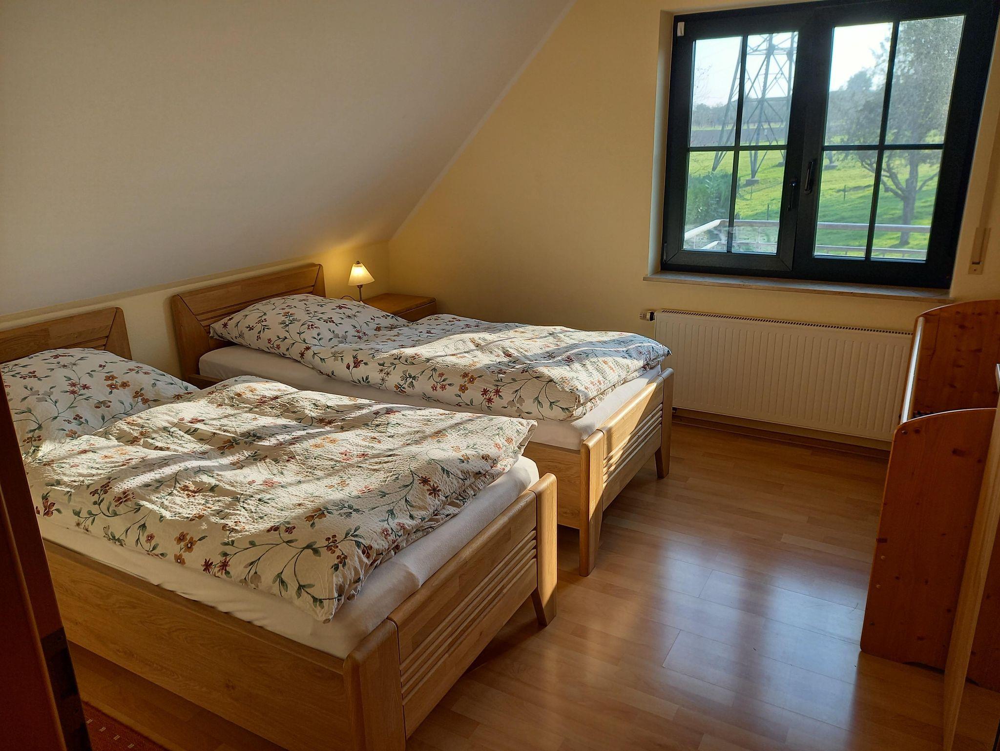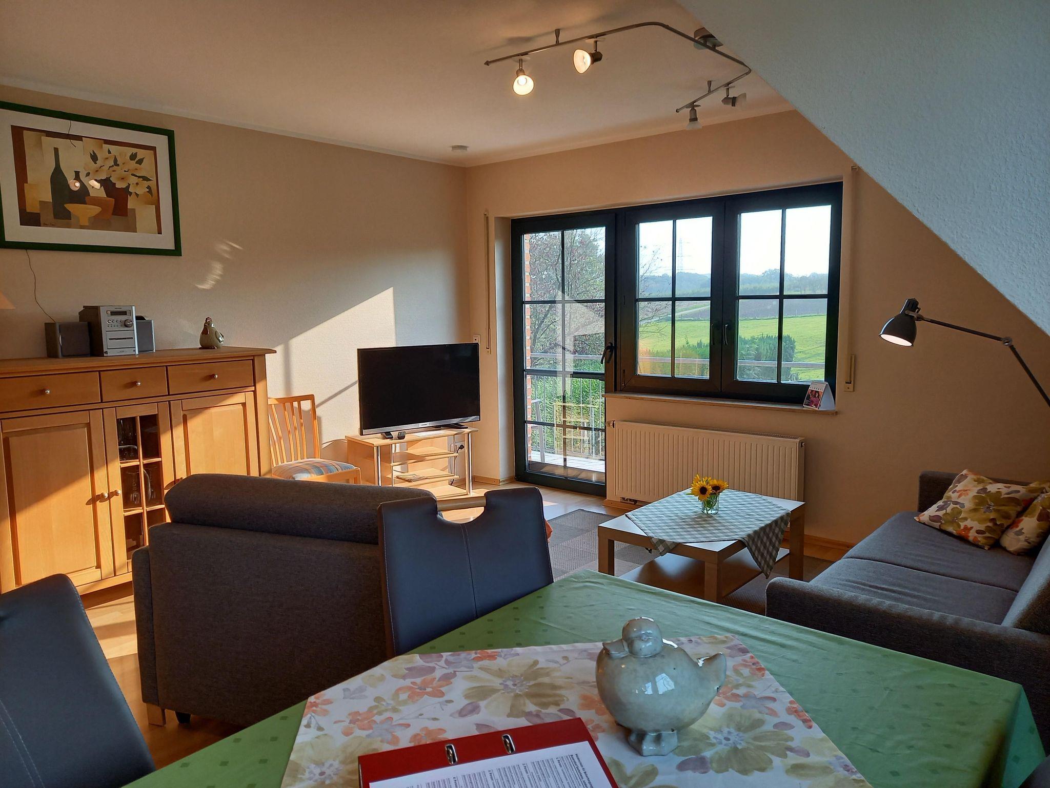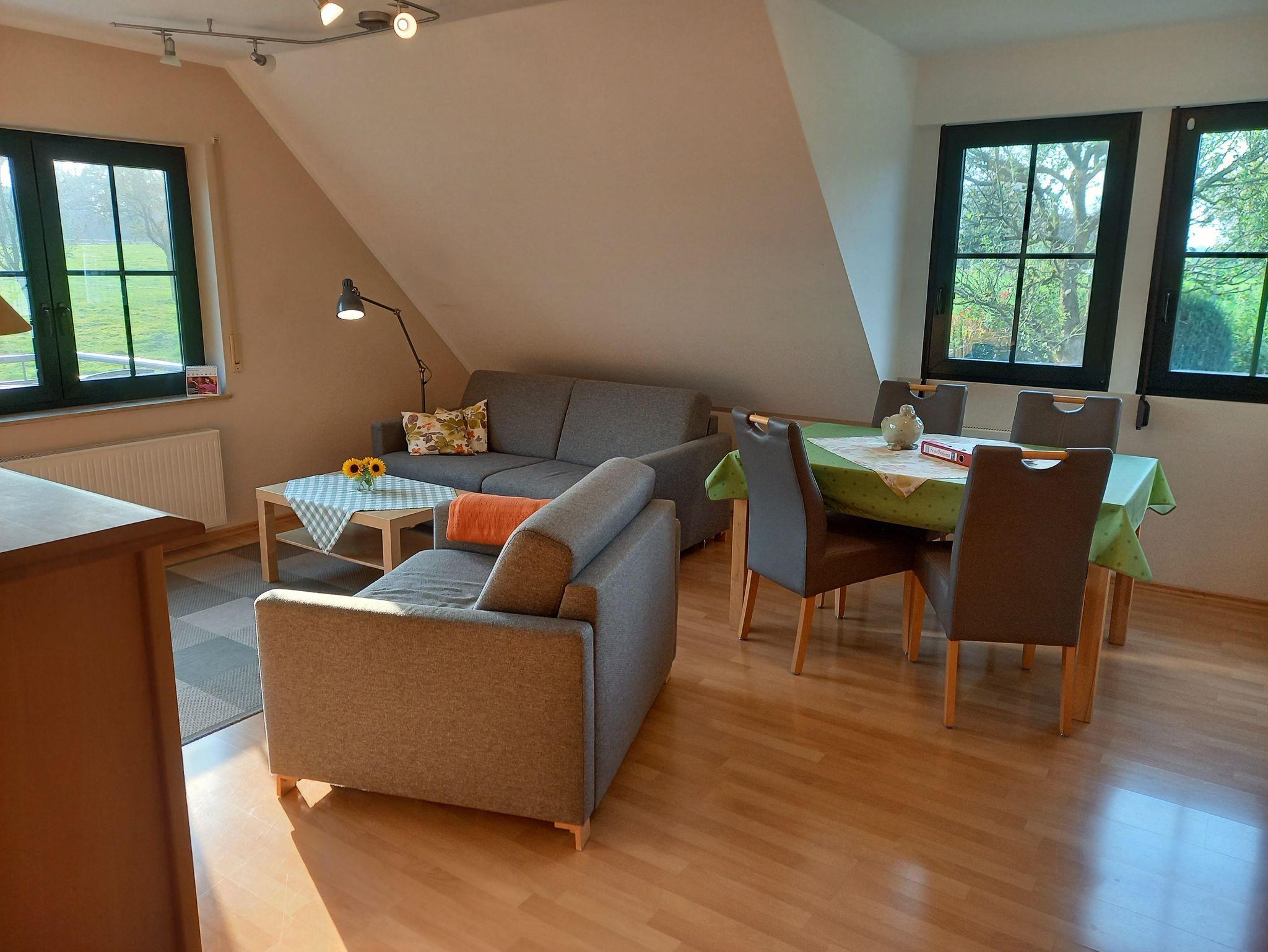 Unsere gut ausgestattete Ferienwohnung bietet Platz für 2-4 Personen. Sie besteht aus einem großen Wohnraum mit 2 Schlafsofas, SAT-TV, Essecke und einer Küchenzeile mit Backofen und Geschirrspülmaschine. Außerdem stehen Ihnen ein Schlafraum mit 2 Betten und ein Duschbad zur Verfügung. Handtücher und Bettwäsche sind natürlich im Übernachtungspreis enthalten. Genießen Sie den Blick ins Grüne. An warmen Tagen können Sie auf dem Balkon sitzen und die Seele baumeln lassen.